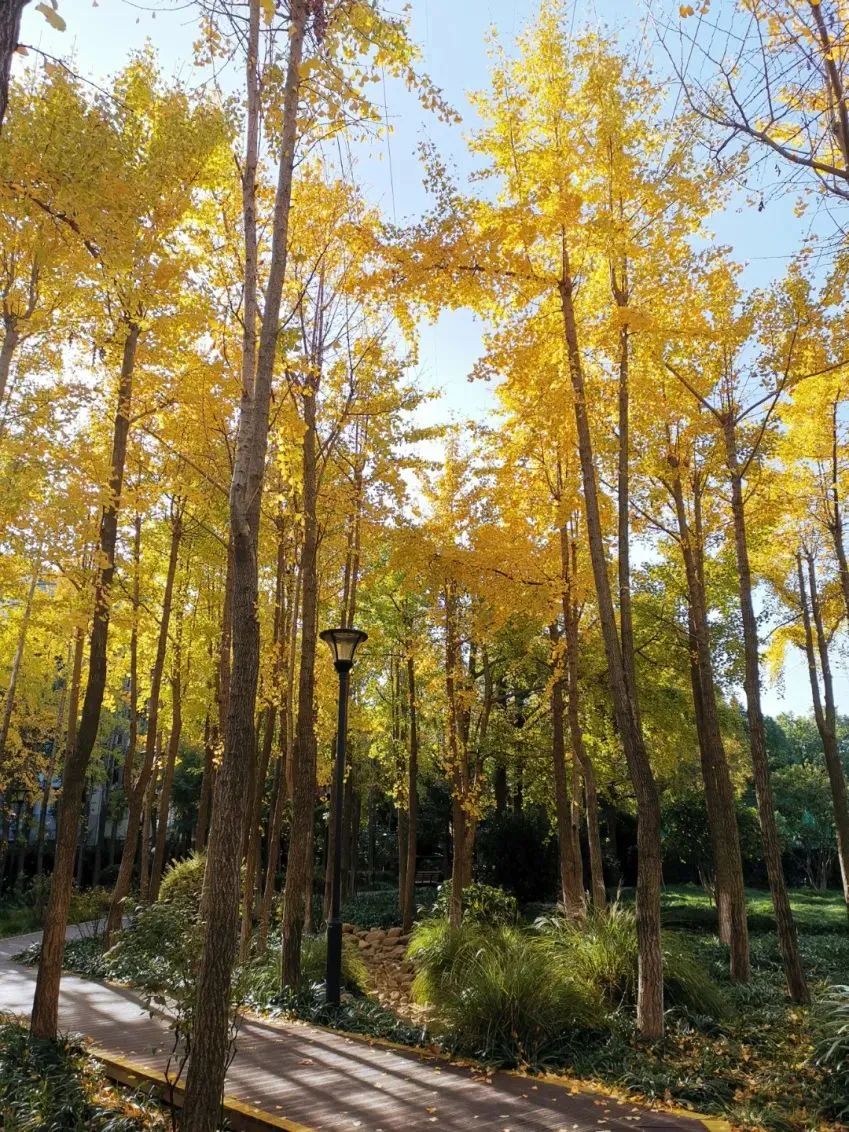 彭浦四季公园的林间植被多样,阳光穿梭在林间与落叶嬉戏,栈道上的银杏落叶,铺就如梦似幻般的金色地毯。