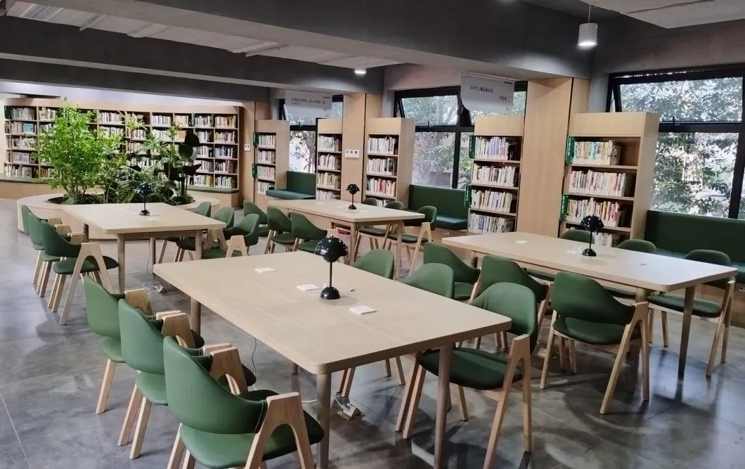 设计理念上,新馆采用微水泥肌理外观,工业风的结构装饰隐喻钢筋水泥下都市快节奏的当代生活,新空间中的“绿色”喻义为读者打造心灵栖息的绿洲。作为街道建设“一刻钟便民生活圈”中“国潮范”样板间代表,新馆现代化的设计理念、丰富的馆藏资源和便捷的服务功能,将成为市民学习、交流、休闲的温馨空间和知识殿堂。