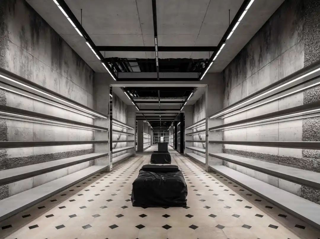 内饰设计团队从场所环境出发,诠释原始建筑风格概念,探索建材表面风化效果。经过处理的高天花板和立柱露出内部支撑结构和钢筋骨架。原始建筑风格概念的核心是内在的可持续性:原有的建筑结构得到充分尊重,新材料的使用受到限制,从而在各个层面上贯彻Balenciaga的可持续原则。