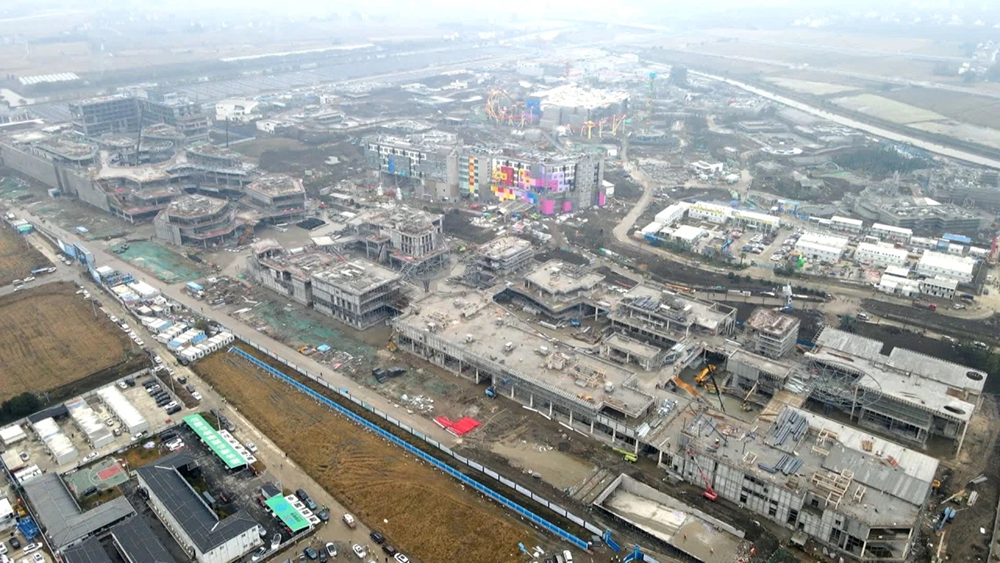 上海乐高乐园配套商业街“无限缤纷里”项目总建筑面积24.78万平方米,于2023年8月开始施工。据项目工程部经理张忠介绍,目前,所有的主体结构已经封顶,已经开始二次结构施工、粗装修以及机电安装工作。