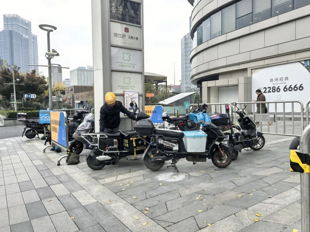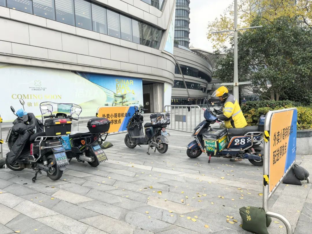 中午12点是外卖配送高峰期。记者在该区域注意到,大部分外卖员都能按照告示牌将车辆停放在指定位置,然后进商场取餐。“停在这里进商场也就几步路,一般可以在十分钟内完成取餐,然后骑车离开,整个流程还是很方便、人性化,”一位外卖员告诉记者,“我们以前会把车停在马路下面,其实大家都知道这样是不安全的。现在有规划、有管理,不仅安全了,还更有秩序了。”上海白玉兰广场物业管理中心相关负责人王翔表示:“考虑到外卖员车辆周转速度很快,我们目前划出的这片区域可容纳30至40辆外卖车辆。物业方面也增派了人员来跟进停放点的管理和服务。后续将根据点位饱和度、外卖员需求反馈等实际情况,进行相应优化调整。”