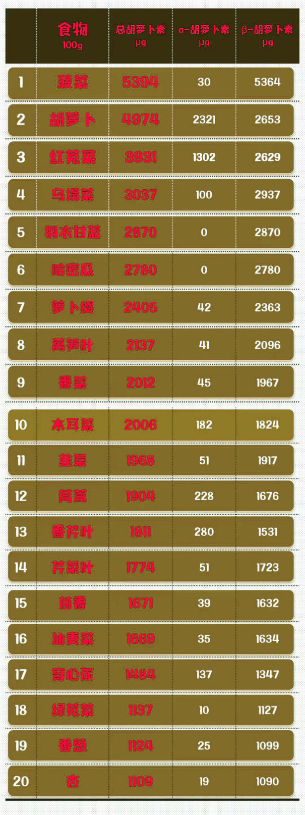 深绿色叶菜中胡萝卜素含量也非常丰富,只是橙黄色被叶绿色遮盖不被我们熟知,如豌豆尖的胡萝卜素含量就高达2710μg/100g,菠菜、香菜、莴笋叶、芹菜叶、油麦菜、木耳菜、韭菜、穿心莲等也是十分丰富。