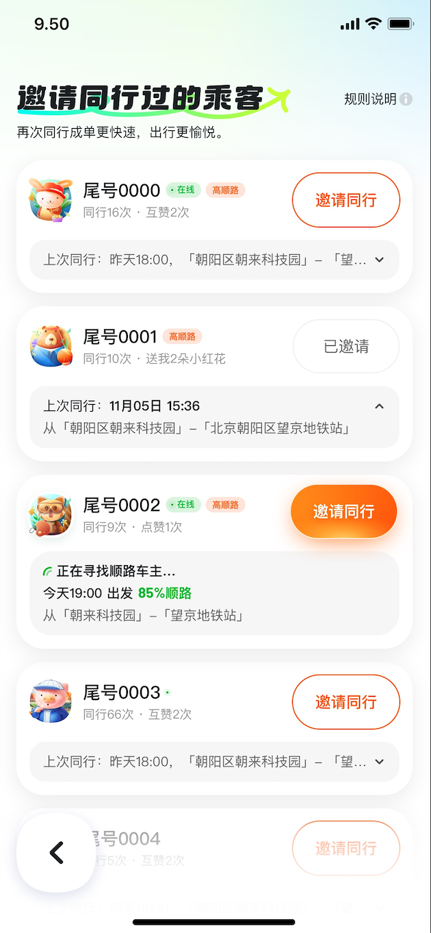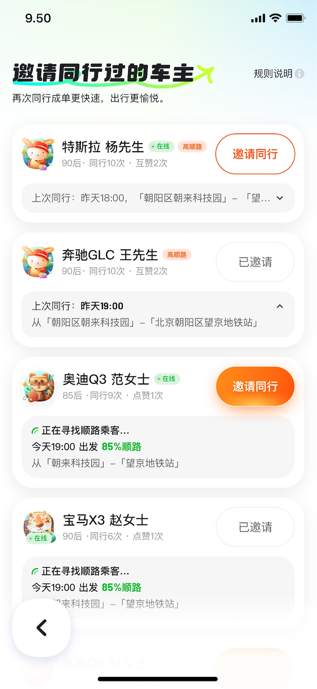 如今,大学生对于高性价比的品质出行需求日益增长,顺风车日益成为其重要出行选择,另一方面,不少大学位于市郊,或者在市郊有校区,邀请以前同路过的车主,被接单概率更高。而基于平台来邀请再次同行,车乘双方都能享受平台提供的各项安全和保险保障。