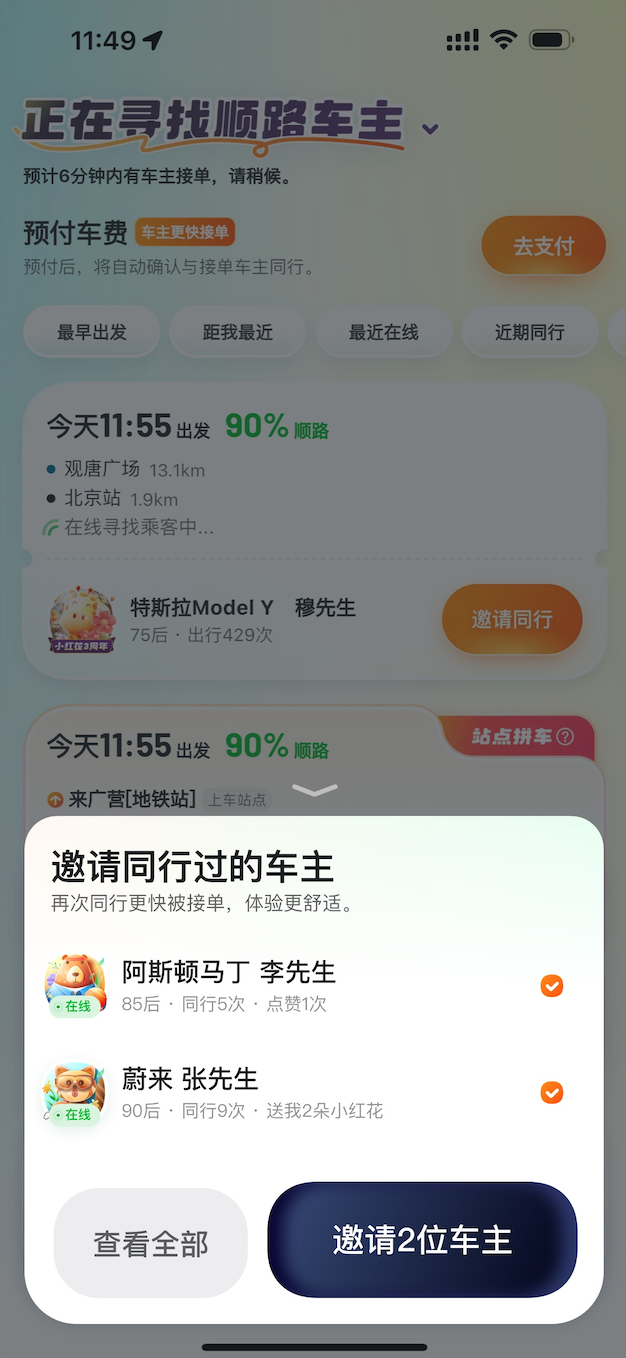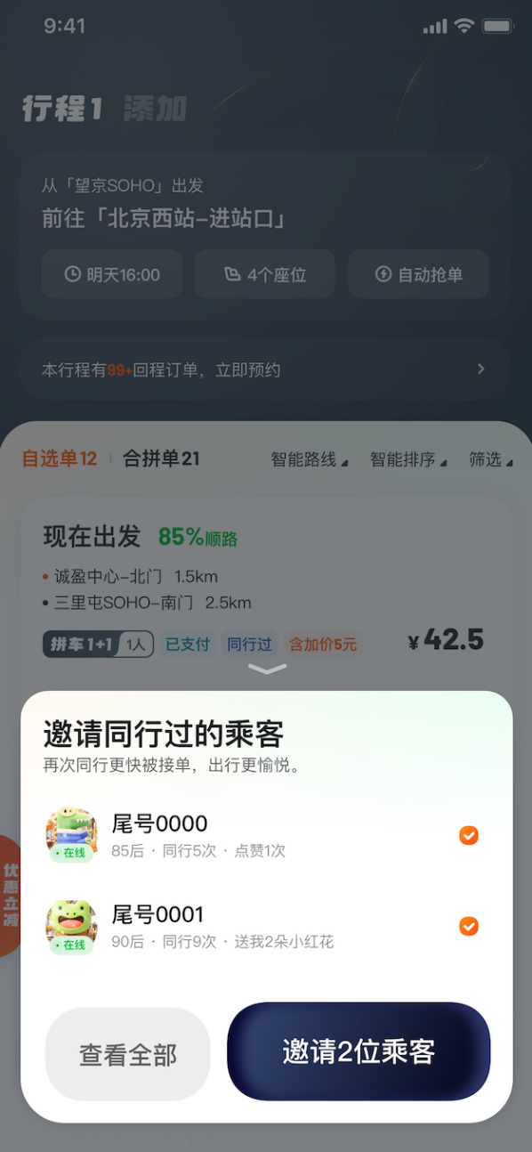 具体而言,乘客下单或车主发布行程后,在顺路订单列表中,同行过的同路人将有专门标识,点击即可邀请再次同行;同时,订单列表的排序维度新增了“近期同行”,点击后将优先展示同行过的同路人;此外,在顺路订单列表中还将设置“同行搭子”入口,点击进入即可看到过往同行过的同路人列表,以及过往同行次数和互评互赞信息,互送小红花数量等。