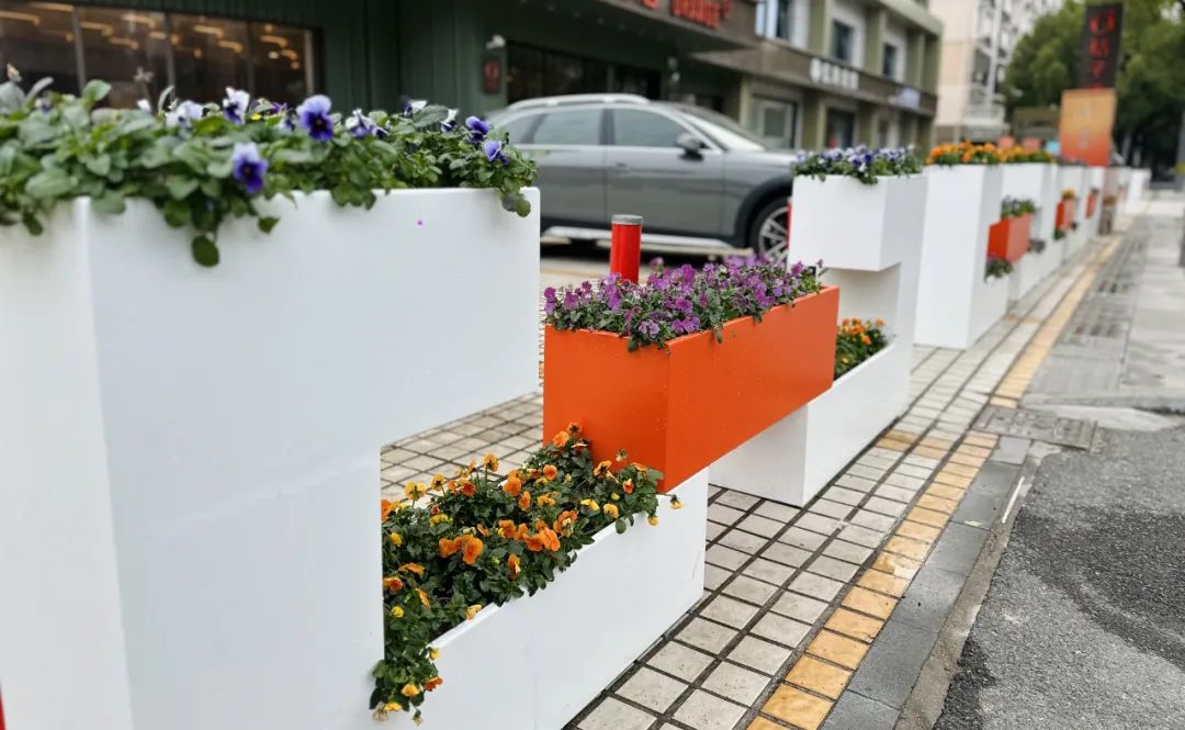 各色花朵悄然绽放,精巧的花坛造型丰富了行人眼前的景色。通过全面修复地面铺砖、更新花坛设计、引入现代绿化理念和高品质植物品种,这一路段将绿化景观和城市功能融为一体。
