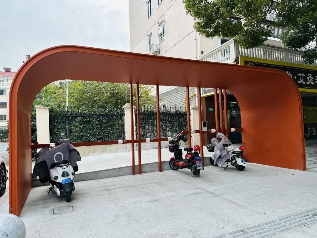 一个橙红色、圆弧形的屋檐成了遮风挡雨的停靠“驿站”,几辆电动自行车正在充电。针对电动自行车停放杂乱无章等问题,这里改造时规划了统一充电区域,电动自行车可以有序地停放并充电,城市面貌得到有效提升。