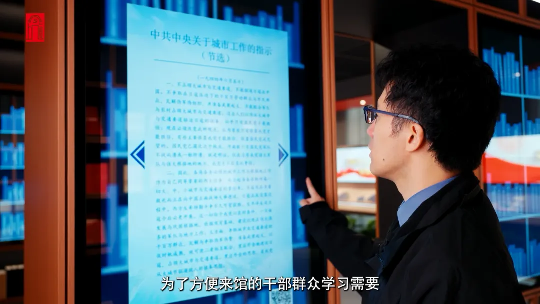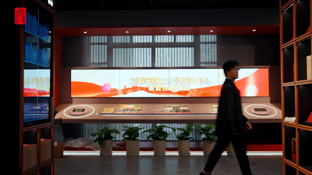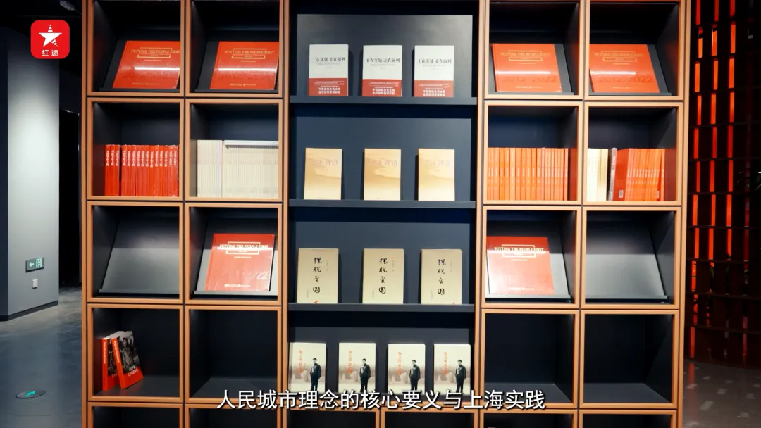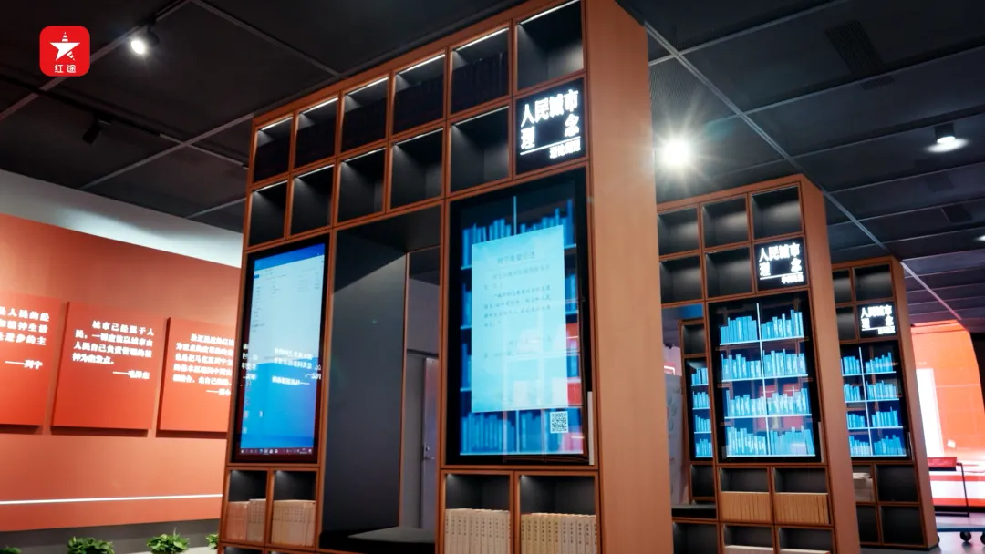 上海人民城市实践展示馆综合运用多样态的电子化展陈手段,串联起不同主题的“触动空间”,生动呈现人民城市理念的核心要义与上海实践。我们可以通过四排“电子+实体”书架,整体了解理念的发展概述与理论渊源等内容。