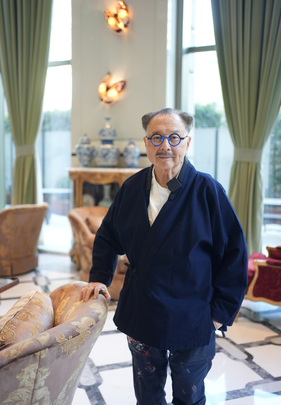 事实上,他这一身汉服混搭球鞋的穿法也很麒派。拍视频时,他大方站起来展示黑布裤子上的颜料彩点:这些不规则的色彩,都是画画的时候溅上去的,这是自然的艺术,中国人讲究不刻意为之。