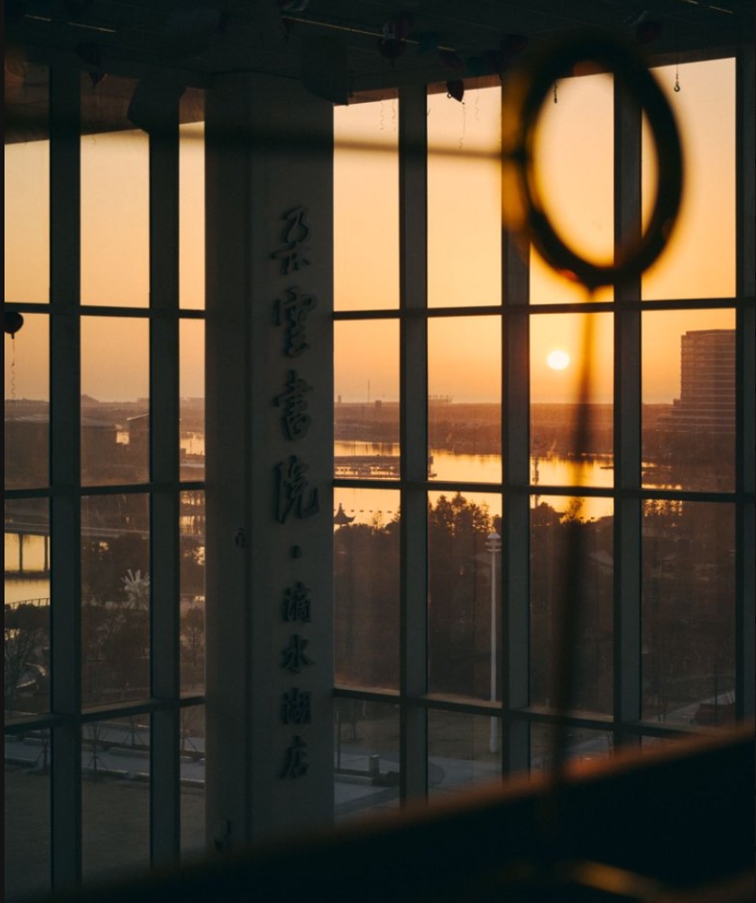 低头可翻阅书卷,抬首能远眺湖景。书店高达20米落地窗外,浮云飘逸,阳光灿烂,湖水温柔。