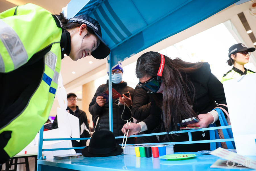 现场持有“平安”打卡手册的市民群众,在各公安警种布置的摊位前互动打卡,盖上专属印章,并参与各类趣味互动答题,学习各种安全防范知识。