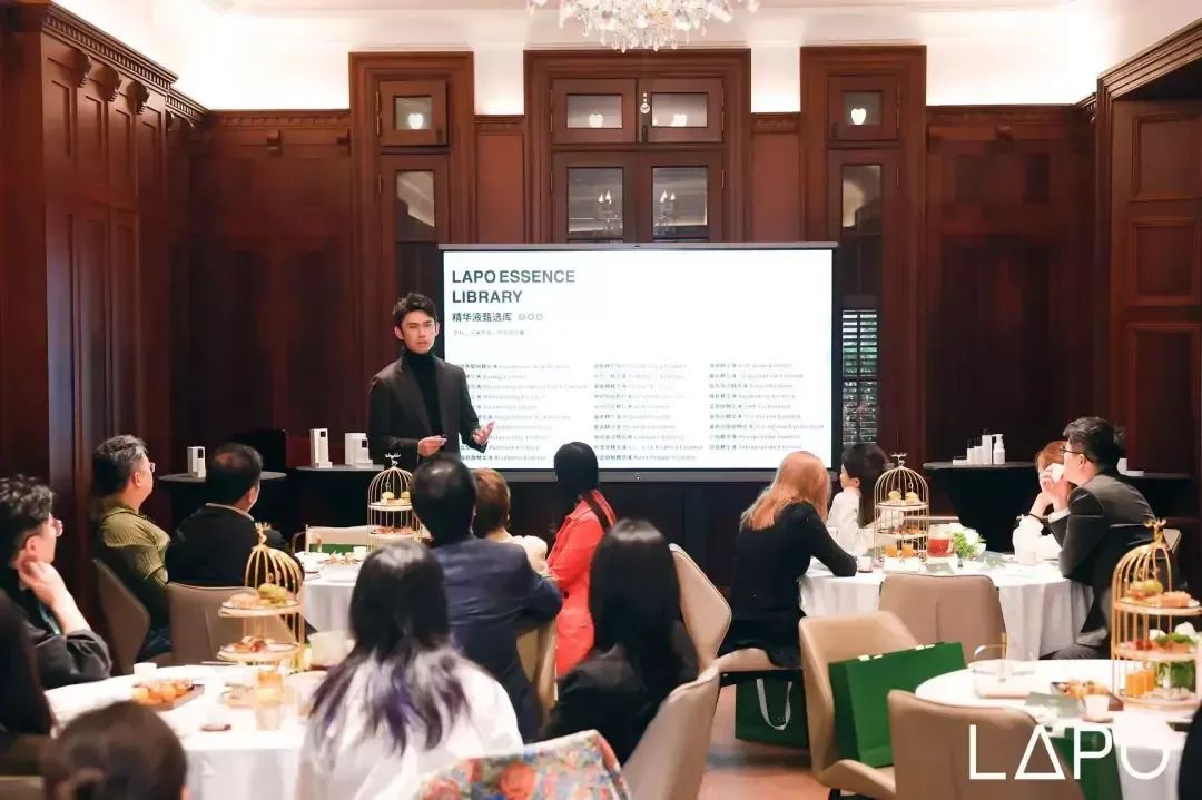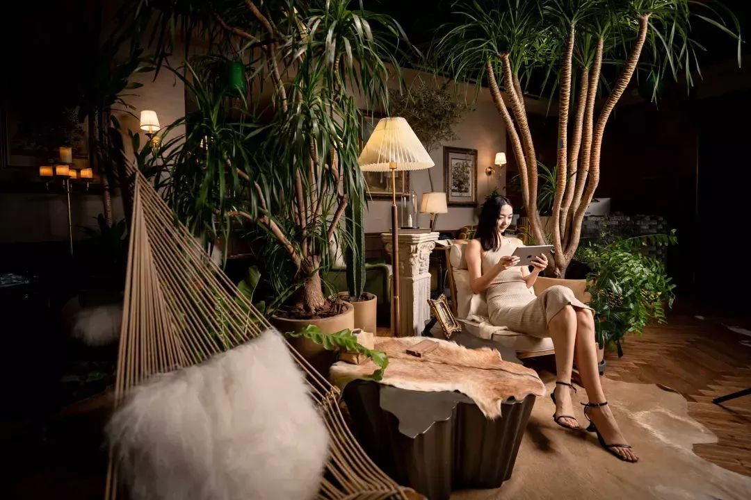 推开厚重的木门,黄棕色的暖光洒落,具有东南亚风情的绿色植物点缀其间,脚下木块发出的微微的吱吱声。将我们引入了LAPO的“护肤秘境”。在这里,暖光、植物、毛绒地毯,为消费者营造出放松惬意的环境,让他们身心得到充分的休息和舒缓。
