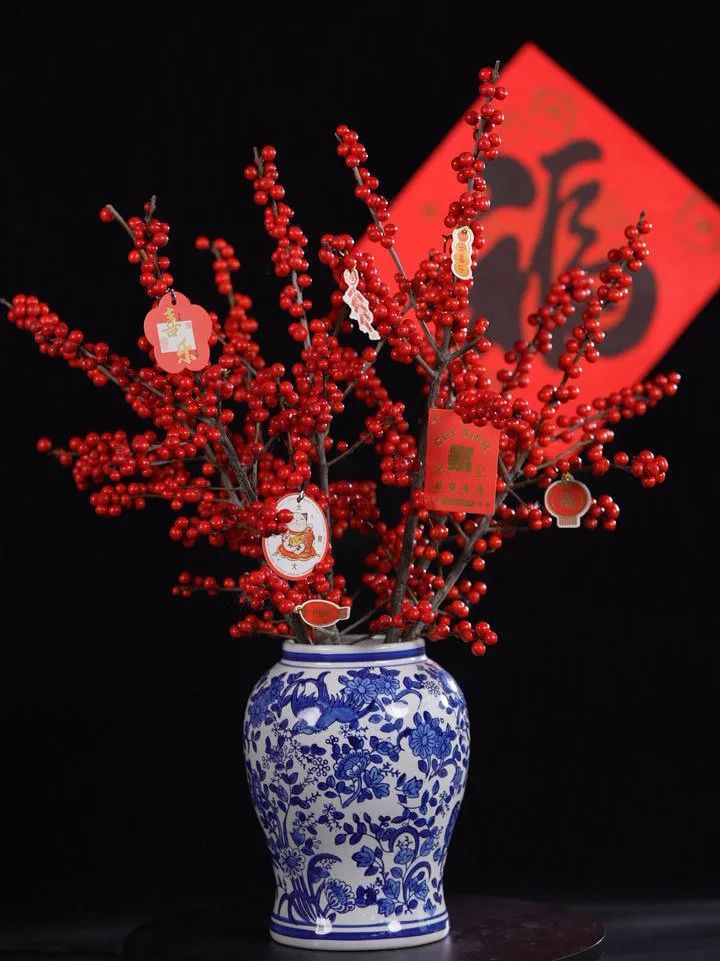 醒花后,将北美冬青枝条插制到花瓶中,水位高度建议为花瓶的1/3。操作时要轻柔,避免碰落果实。插制完成后,可以挂上一些卡片,营造新年的氛围。