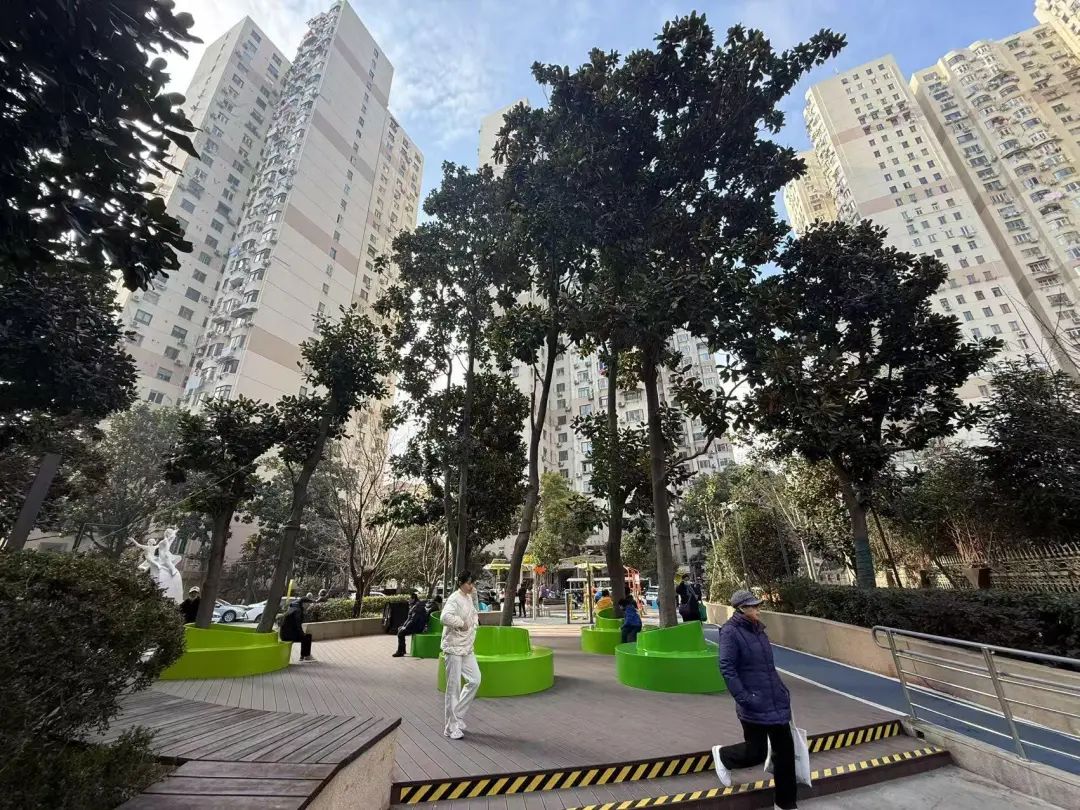 在城市更新的过程中,让更多市民共享公共空间,已经成为践行“人民城市”理念的生动实践。自2021年起,上海明确了通过新建新增一批、改造提升一批、认建认养一批、社会共享一批的形式,累计完成2.5万余处公共休憩座椅优化提升,让上海不仅可以漫步,还成为一座可以“坐得下”的城市。在西凌家宅路上的西凌新村,通过场地修缮、绿化提升、新增座椅等形式,一个崭新的街心花园既保留了曾经小区的历史,也成为市民休憩的新场所。