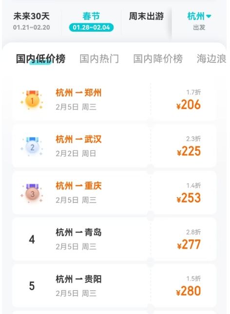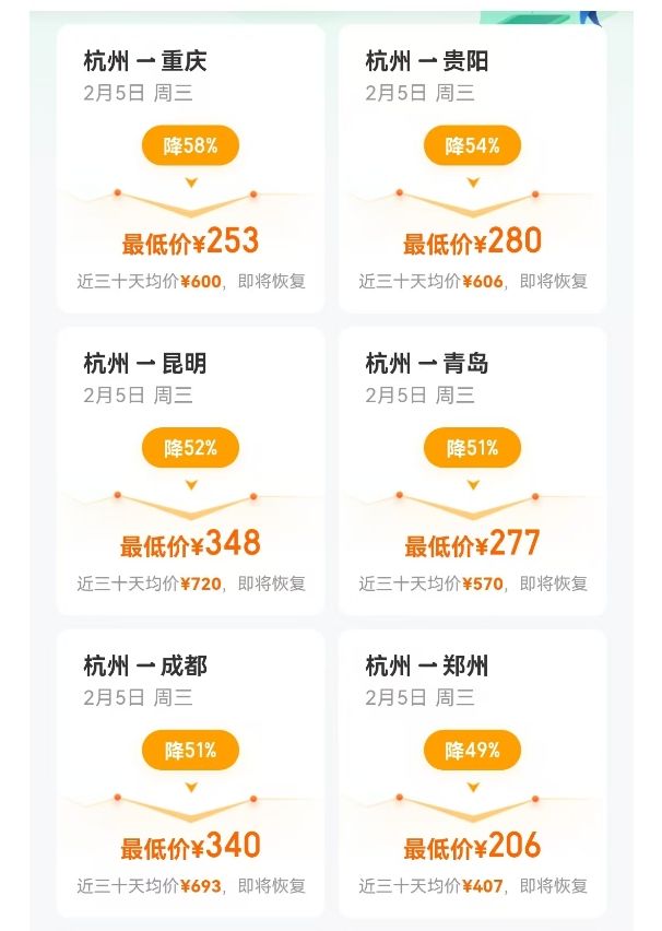 以杭州出发的机票为例,春节假期期间,杭州到重庆降价58%,到贵阳、昆明、青岛、成都等,降价都超过了50%。