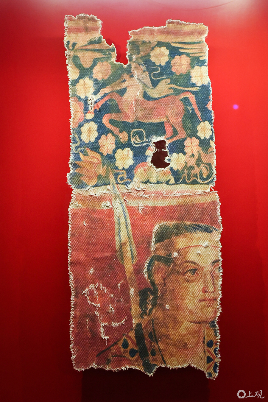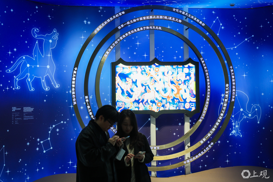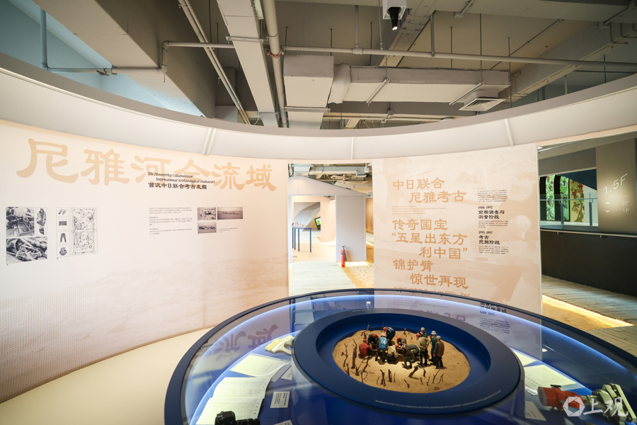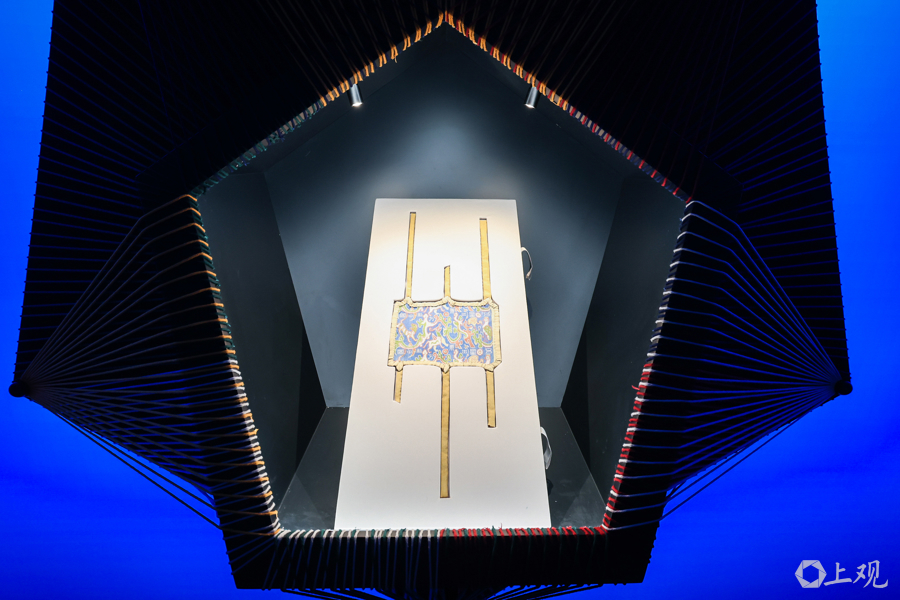 据介绍,新疆博物馆镇馆之宝“五星出东方利中国”锦护臂(复制件)及百余件珍贵文物级展品首次在上海展出。