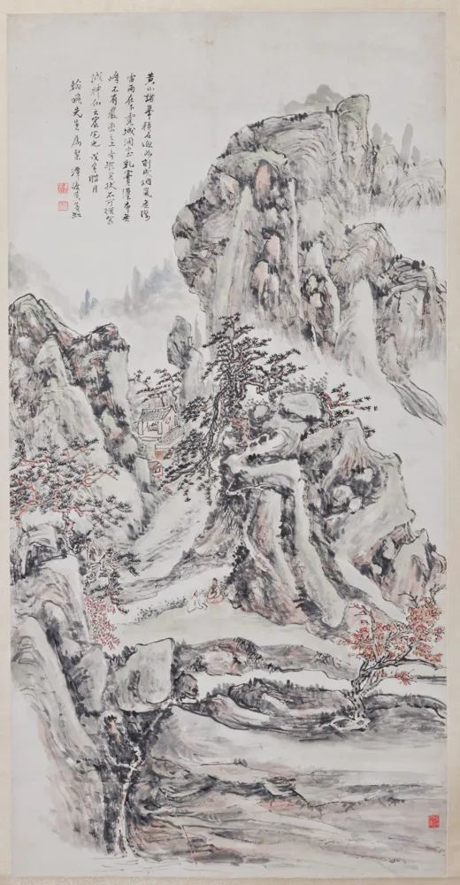 图以全景式山水绘黄山诸峰高耸入天,气势雄阔。岩间时有怪松斜出,形态各异,似在以不同姿势向画外的观者打招呼。数间房舍掩映在树石之间,两高士在不远处忘我清谈。黄宾虹没有写出具体是黄山哪几座峰,您能看出来吗?
