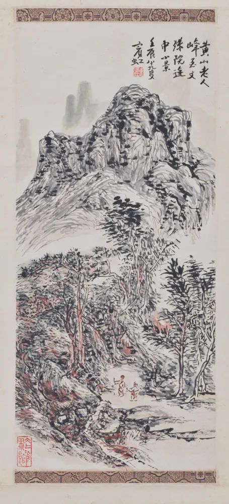 《黄山小景》 纸本设色,1952年,安徽博物院藏。题款:黄山老人峰至文殊院途中小景。壬辰八十九叟宾虹。钤印:黄宾虹(白文)、冰上鸿飞馆(朱文)