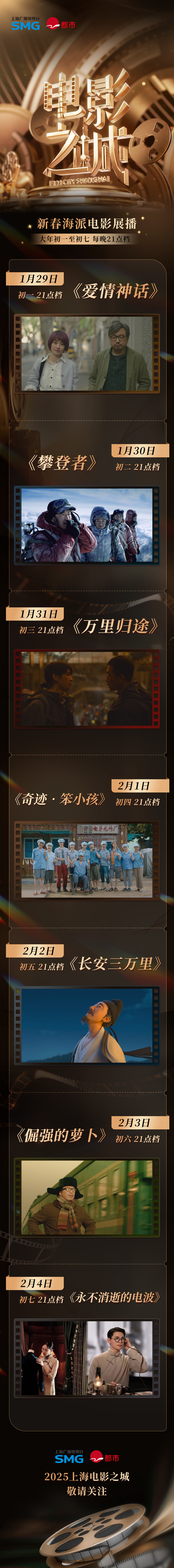 从新春海派电影展播到普法微短剧,都市频道聚焦“上海出品”,打造了一系列春节节目。大年初一至初七,都市频道将推出“上海电影之城——新春海派电影展播”,每日晚间21点档播出“上海出品”的精品电影,包括《爱情神话》《攀登者》《万里归途》《奇迹·笨小孩》《长安三万里》《倔强的萝卜》、电影舞剧《永不消逝的电波》七部作品,让观众足不出户,即能体验到上海“电影之城”的魅力。