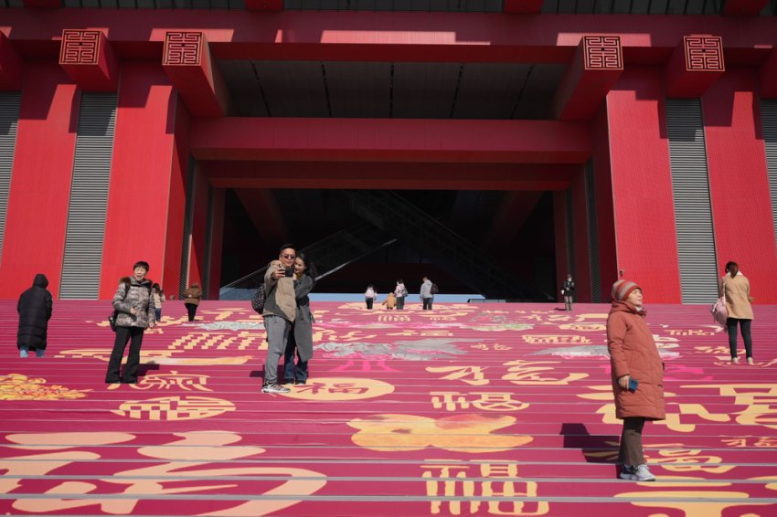 只见葫芦地贴精心镌刻66个造型各异“福”字,且将缶翁画中的吉祥元素如“梅、柿、竹、水仙”等巧妙融入,随着观众拾级而上,美好福瑞在周身环绕,一整年的顺遂也由此开启。