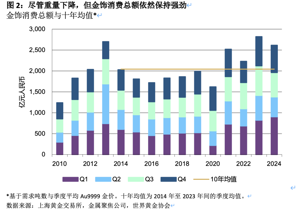 即便如此,值得注意的是消费者虽然降低了所购金饰的克重,但其总体预算并未下降太多,全年总价值为2615亿元,同比微降7%,为历史第三高。2024年飙升的金价固然是主因,但更高的消费频次或更广泛的消费人群基础也有可能是助推动力。