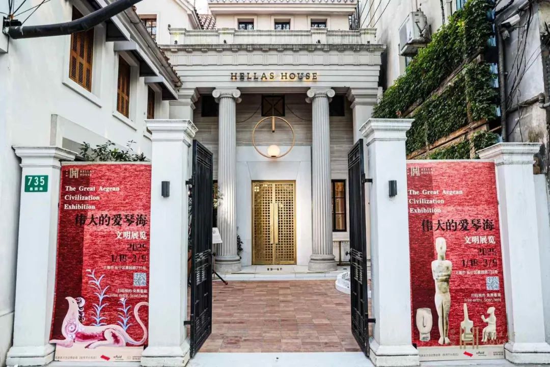 希华馆位于愚园路735号,是进博会“6天+365天”交易服务平台之一,本次展览也是其开馆以来首次全面向公众开放。入口处,矗立着优雅精致的爱奥尼克柱,走进宏伟气派的展馆,基克拉迪文明、米诺斯文明、迈锡尼文明等内容板块徐徐展开。