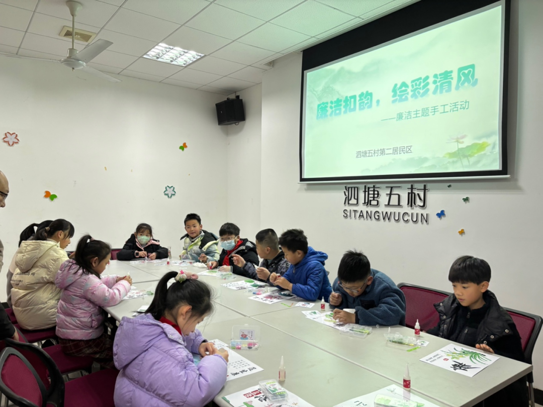 寒假期间,宝山区张庙街道泗塘五村第二居民区组织了一场以“廉洁扣韵,绘彩清风”为主题的手工纽扣画活动。