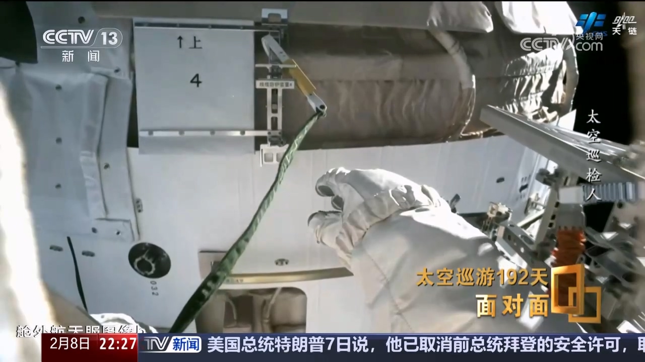 李广苏:当时是爬到第一个转移路径的末端的时候,01在安装防护装置,我是在舱壁上,除了进行舱壁上的设备巡检,还要对他的安装状态进行确认。因为地面他想通过我的这个摄像头看到他想看到的一些信息,但是我在那个位置,因为已经相当于是一个实验舱的末端了,末端那个位置没有太多的扶手可以供我去抓取。
