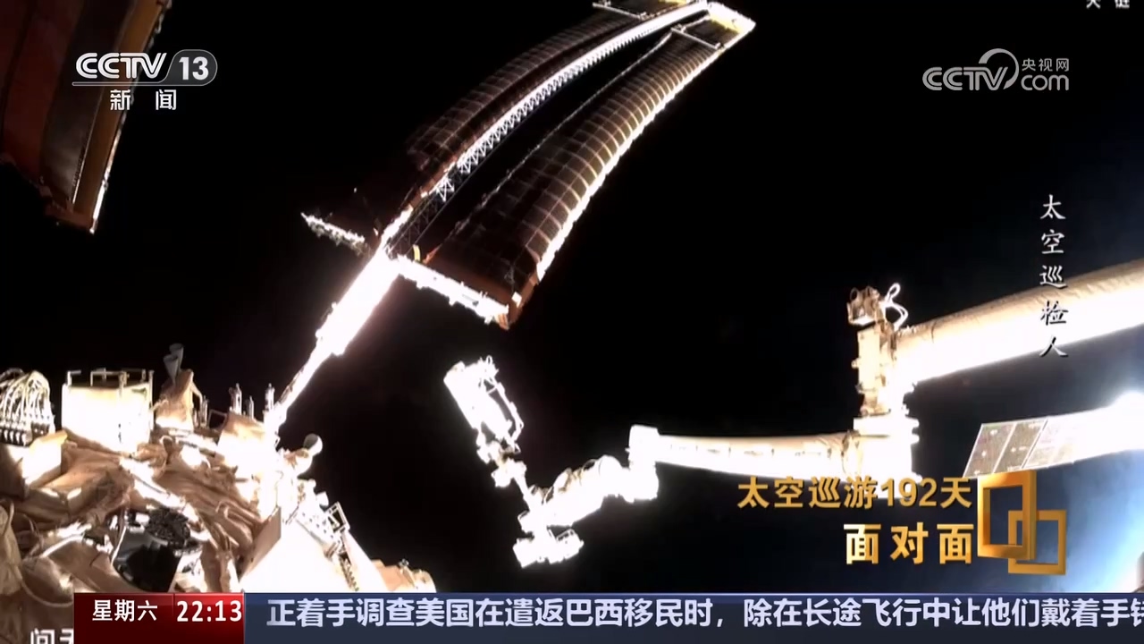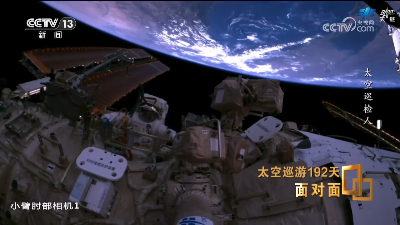 此次出舱活动,其中一项重要工作就是对实验舱太阳翼进行全方位巡检,叶光富搭乘机械臂对问天实验舱外的太阳翼进行巡检,李广苏则先攀爬至问天实验舱区域进行巡检,然后再到达梦天实验舱的区域进行巡检。