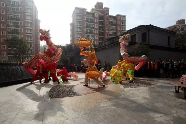 江川路街道文艺表演团队在闵行老街旧址的项宅前表演《鲤鱼跳龙门》