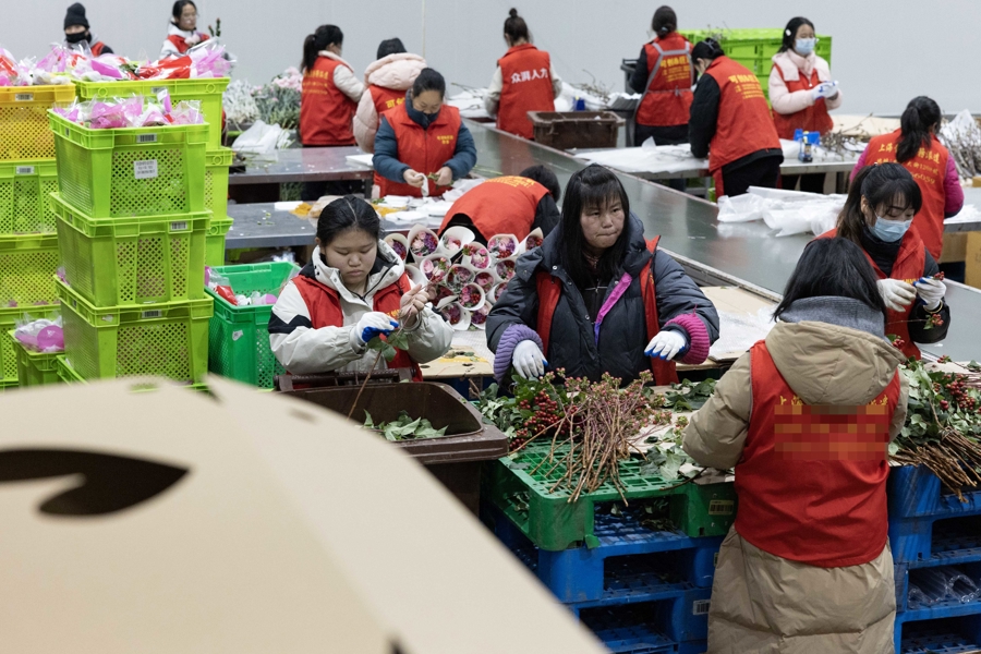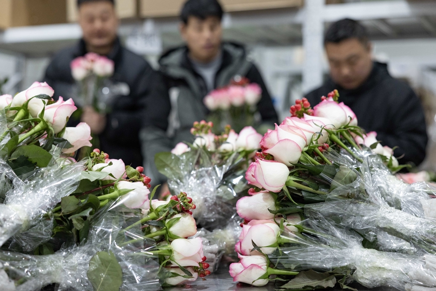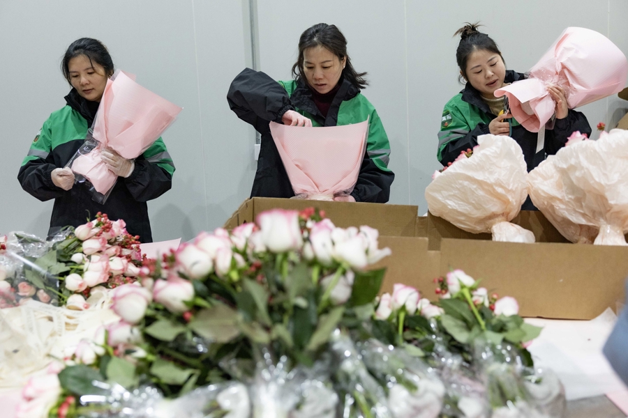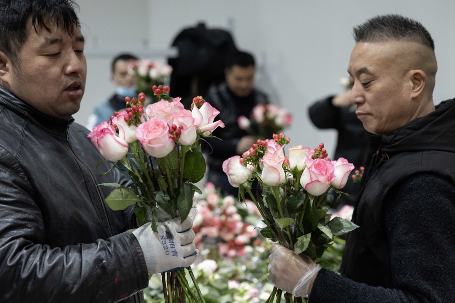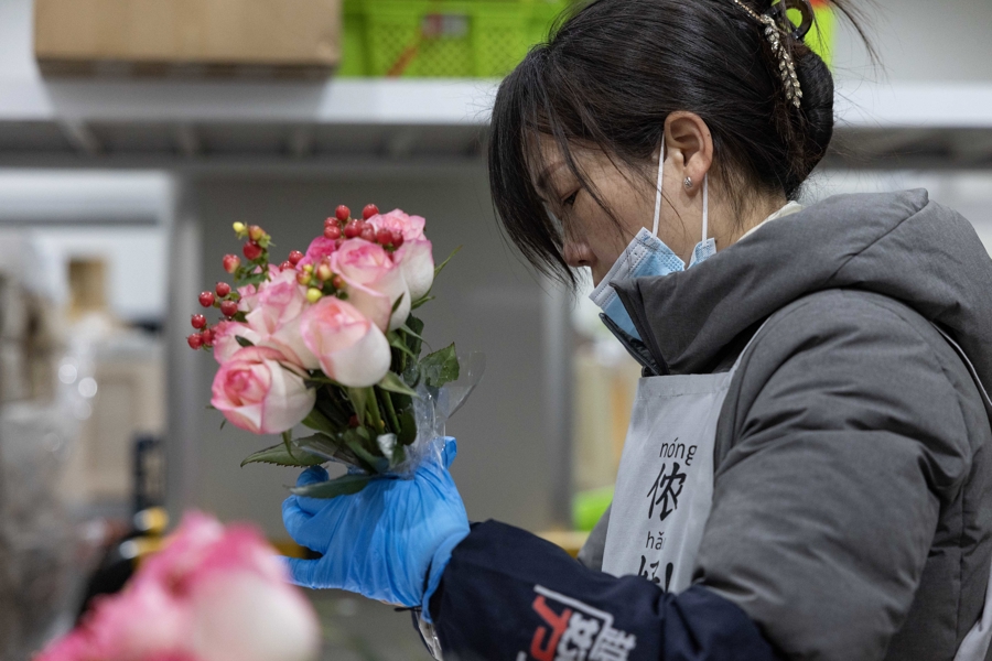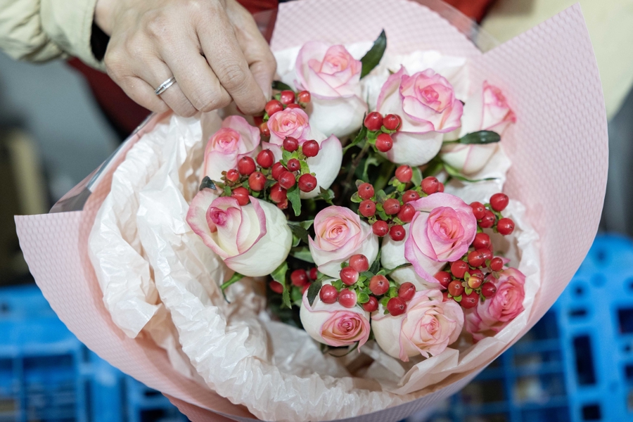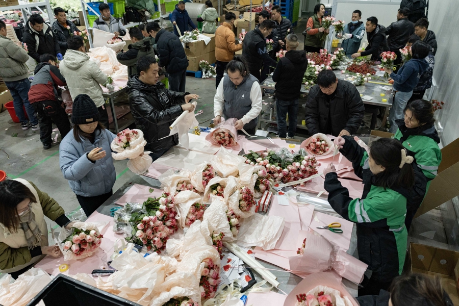 情人节的临近,手捧花市场需求旺盛。叮咚买菜鲜花华东地区的情人节花束预售订单同比增长一倍以上,每天几万份的花束从这里走向全华东市场。