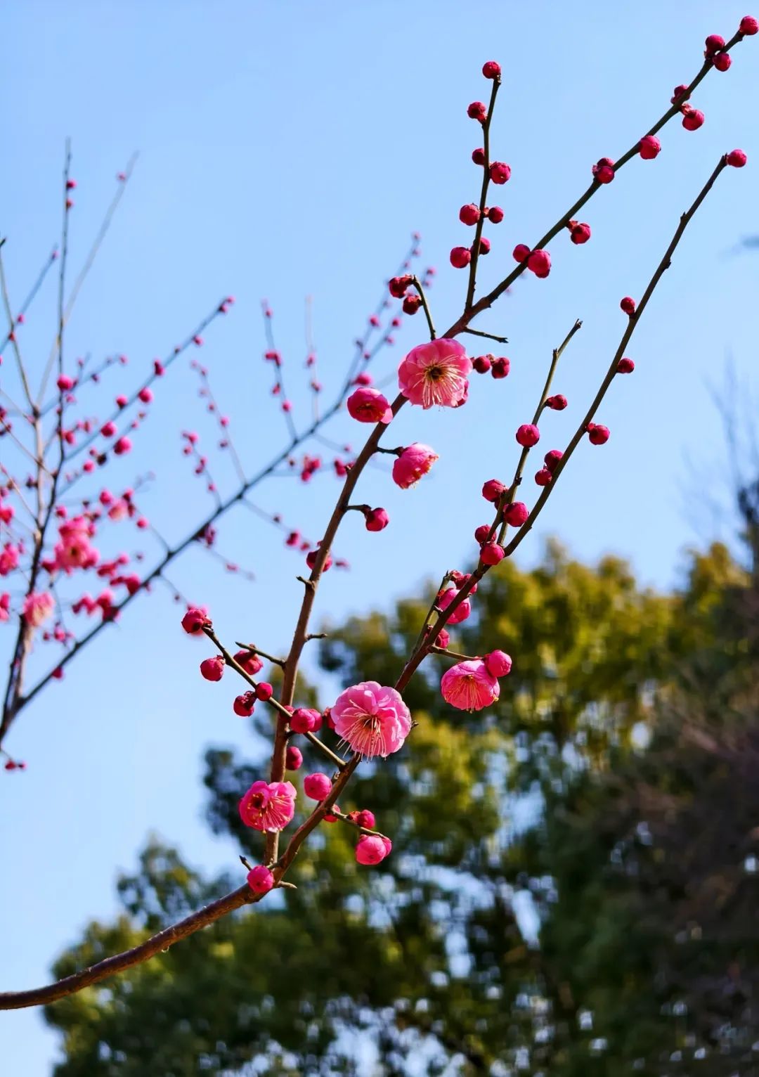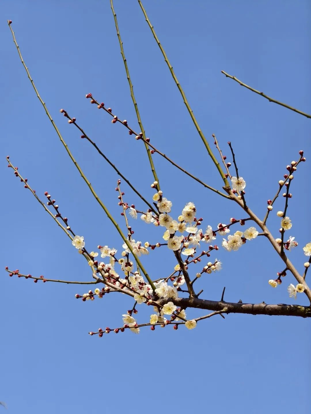 此时的公园内,宫粉梅、江梅、红梅等争相绽放,有的花朵全然绽放,争相簇拥在枝头,吐着花蕊,格外娇俏;有的含苞待放,羞涩的花骨朵高高挂在枝头,别有一番可爱;还有几树白色的梅花已经盛开,花瓣在阳光的照耀下透着温润的光泽,晶莹剔透,吸引不少人观赏。