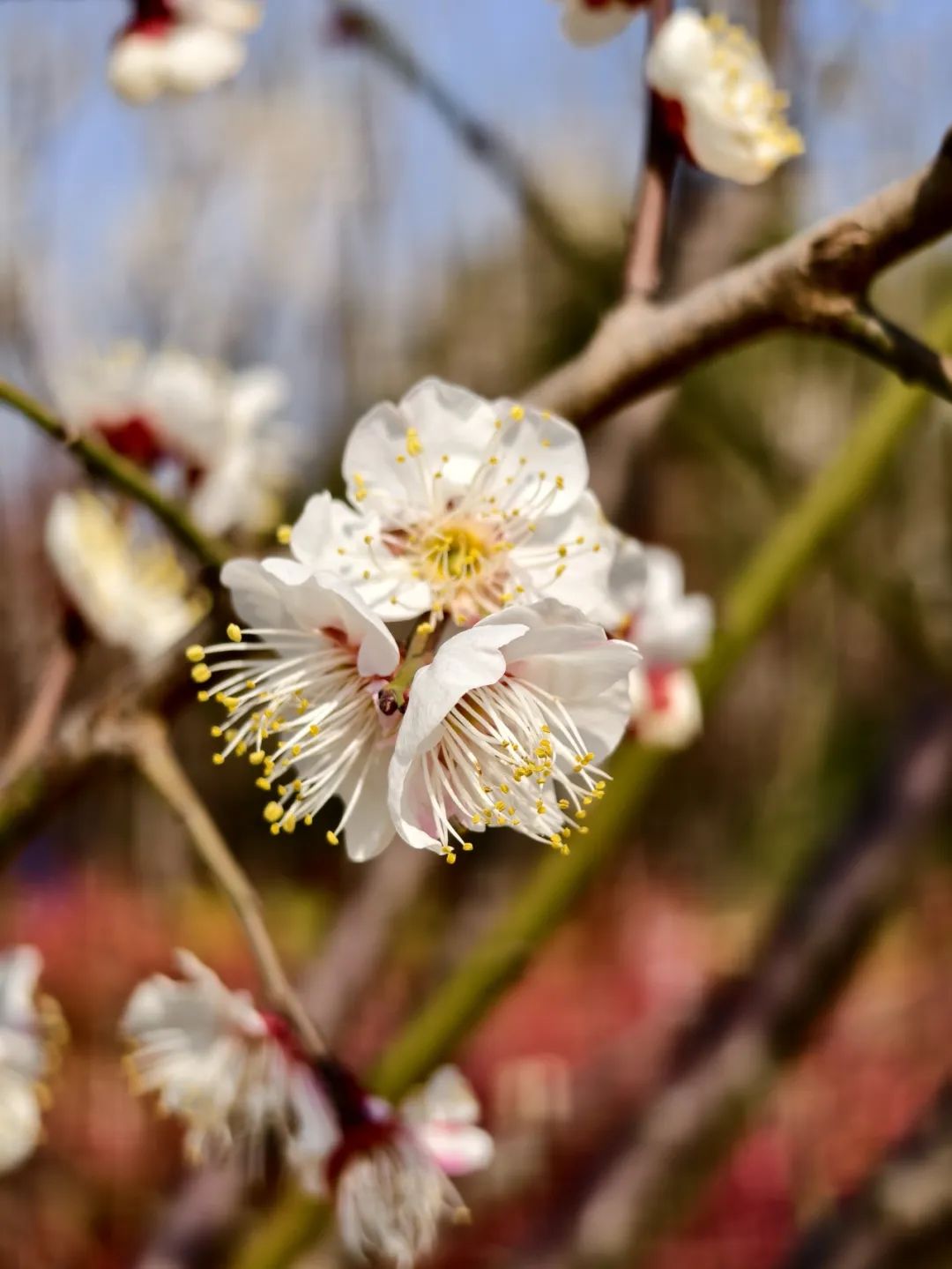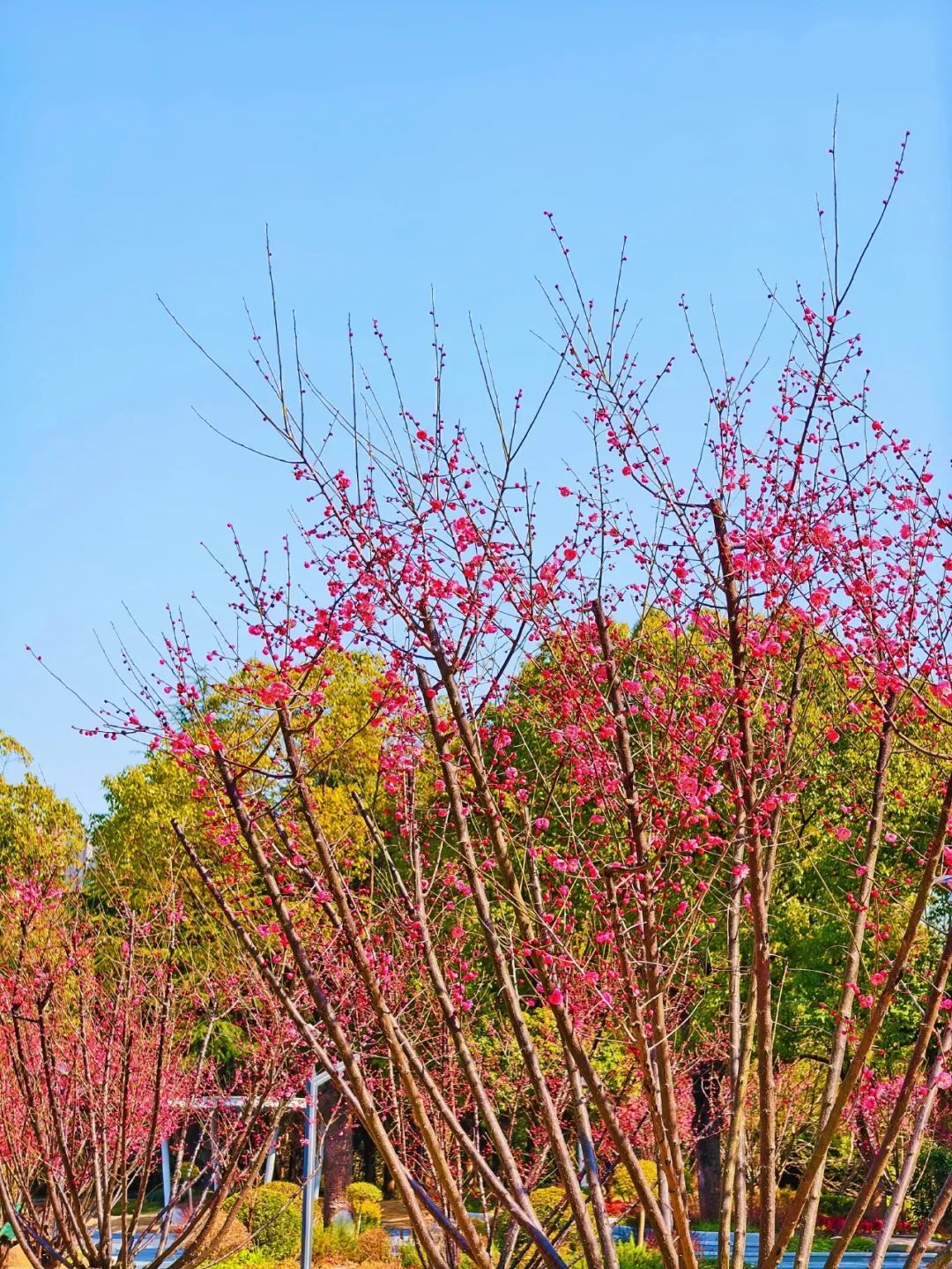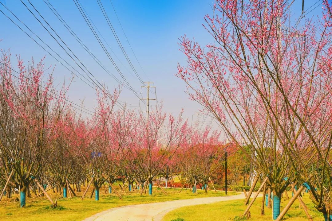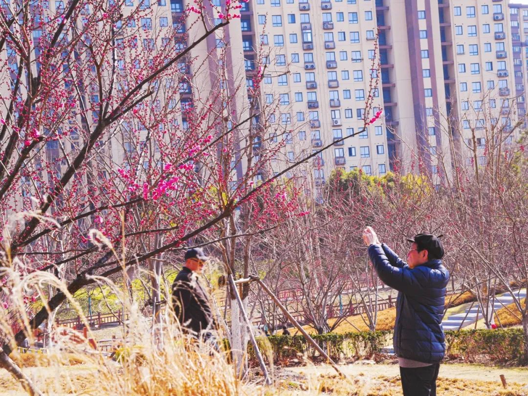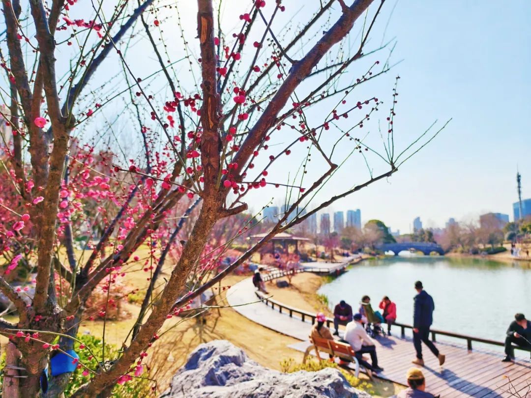 为了方便市民和游客赏梅,公园内设置了多个观景平台和步行道,绽放的梅花花海与公园内的亭子、建筑相映成趣,仿佛一幅天然的水墨画。有人惬意地坐在梅花树下谈天说地,有人躺在草坪上沐浴阳光,还有人穿梭在梅花林中忙着合影……