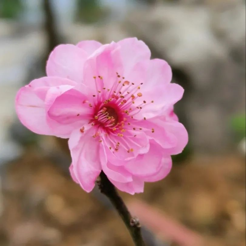 蔷薇科、李属植物,梅花品系中真梅系直枝梅类宫粉型,其花复瓣至重瓣,呈或深或浅的红色。落叶乔木,高达10米。花在冬季或早春叶前开放。