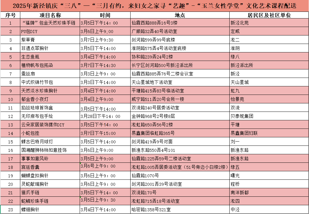 第115个“三八”国际妇女节来临之际,新泾镇妇联精心策划了一场全域沉浸式的节日盛宴。3月3日至3月28日期间,23场主题各异的体验活动将被配送到各居民区、辖区企业等。同时,新泾镇还将联合上海荟聚迪卡侬门店、百联西郊,打造运动风尚双会场,邀请女性朋友们共赴这场春日的浪漫之约。