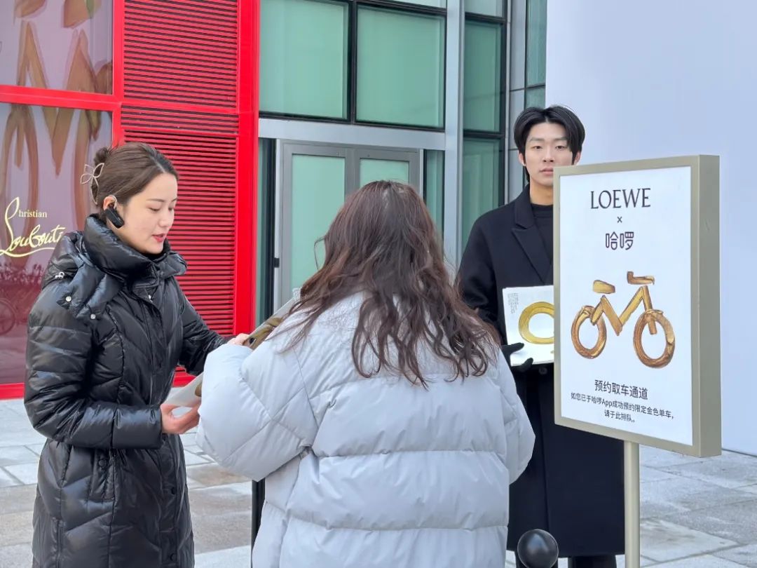 记者注意到,在静安嘉里中心沿南京西路侧的一幅“寻车启事”广告牌下,整齐排列着一排限定金色单车,不时有年轻市民前来咨询参与活动,通过预约取车通道现场取车,随后在新开业的门店前拍照、骑走金色单车,也有不少市民在参加完活动后,前来兑换限定画报和咖啡赠饮。