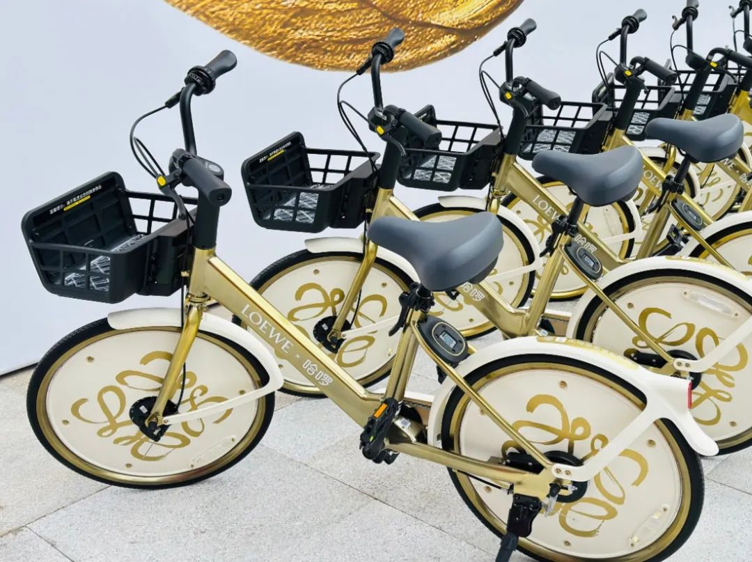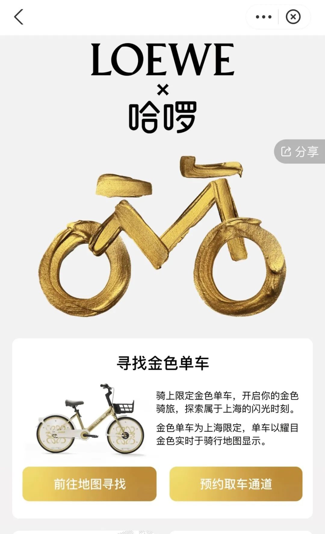 当奢侈品牌LOEWE罗意威遇上国民共享单车哈啰,会擦出怎样的火花?答案就是——一辆印有LOEWE罗意威标志性logo的限定金色单车!