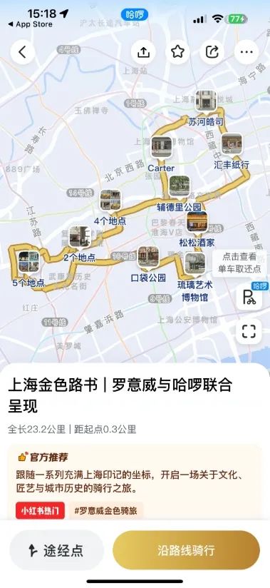 通过哈啰活动主页进入“上海金色路书”页面,骑限定金色单车打卡16个上海充满西班牙印记、匠艺传承、本土社群连结的文化生活的坐标,开启一段关于文化、匠艺与城市历史的“金色骑旅”。