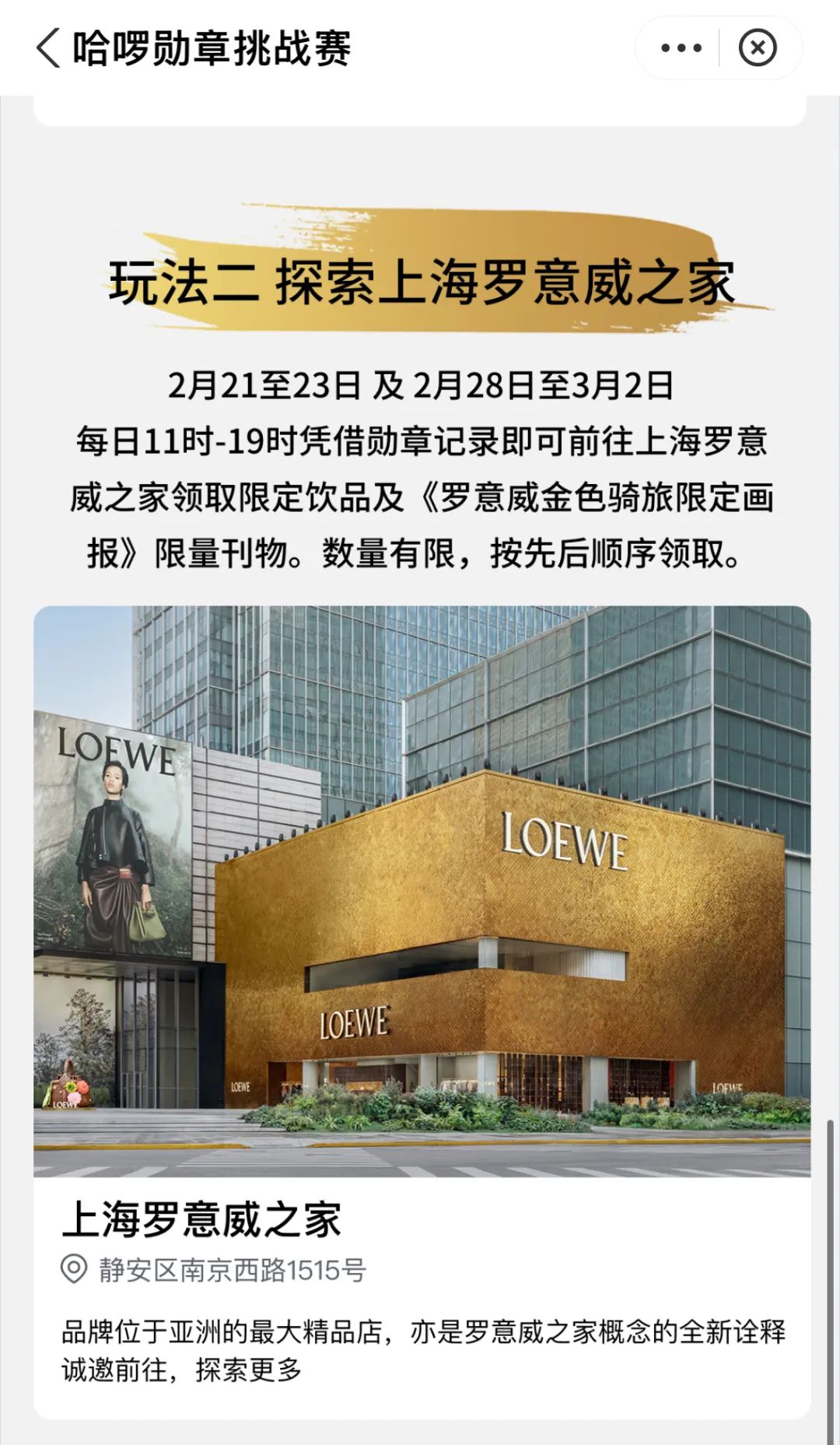 完成挑战赛后,可凭借勋章于2月28日至3月2日的每日上午11时至晚上7时,前往上海罗意威之家限时咖啡车领取限定赠饮和《罗意威金色骑旅限定画报》(数量有限,发完即止)。翻开画报,透过特约作家视角,了解《上海单车迷你文化史》,解锁更多关于LOEWE“金砖匠造”的精彩幕后故事。