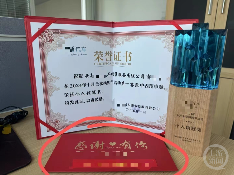 郭先生获得的公司销冠证书。受访者供图
