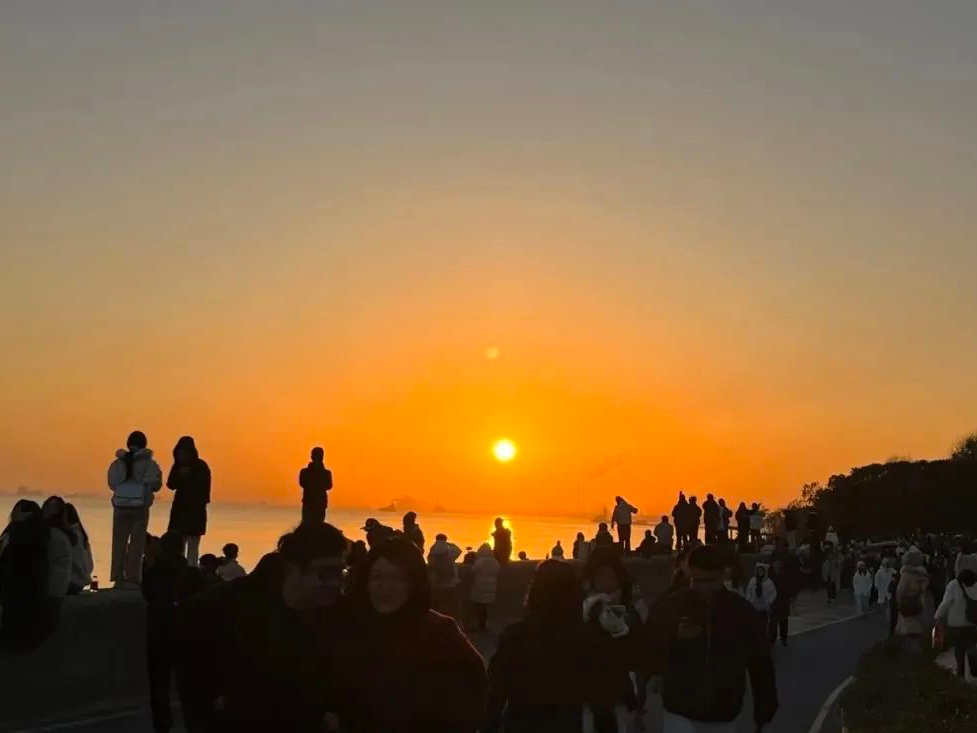 日出,象征着一个新的开始,越来越多的人开始向往这种独特的浪漫。凌晨五点,宝山滨江观景平台已聚集了不少人,虽寒风裹挟着江水的湿气,却掩盖不住众人等待日出的热情。摄影师张先生紧了紧围巾,调整好三脚架的角度。在他身旁,二十多位摄影爱好者早已架起“长枪短炮”,等待晨光刺破江面薄雾的刹那。