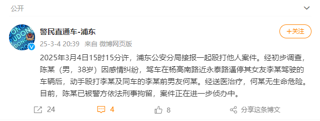 2025年3月4日15时15分许,浦东公安分局接报一起殴打他人案件。