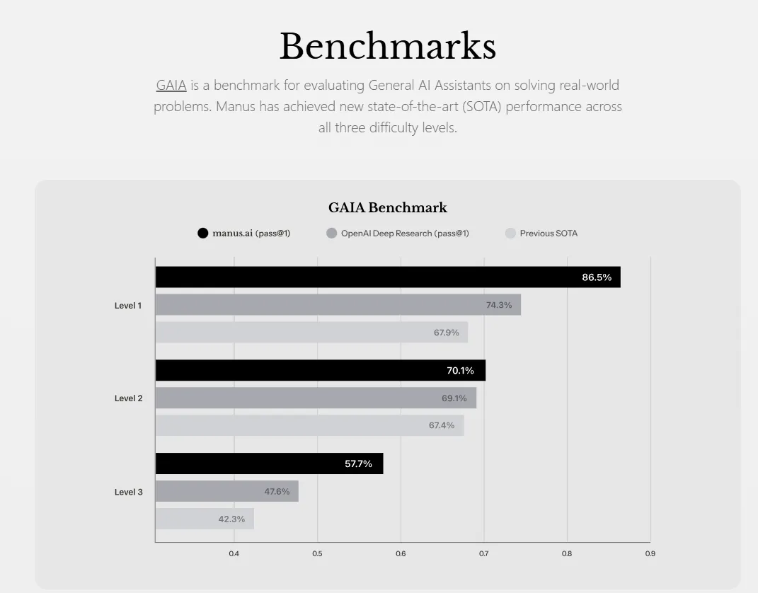 Manus表示,按照GAIA Benchmark(盖亚基准),其工具在所有三个难度级别都实现了新的最先进的性能,超过了OpenAI。