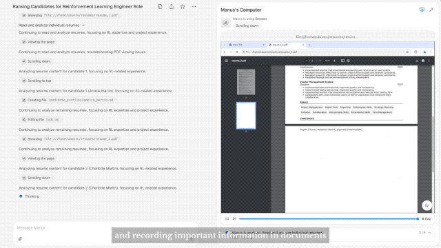 在视频展示的其中一个案例中,Manus可以帮助用户筛选简历。当用户向Manus发送一个包含着10份简历的Zip打包文件时,Manus会像人类一样工作,首先解压文件,然而浏览其中的每一份简历并记录下重要信息,最后梳理出排名建议以及候选人简介、评估标准等附加材料。