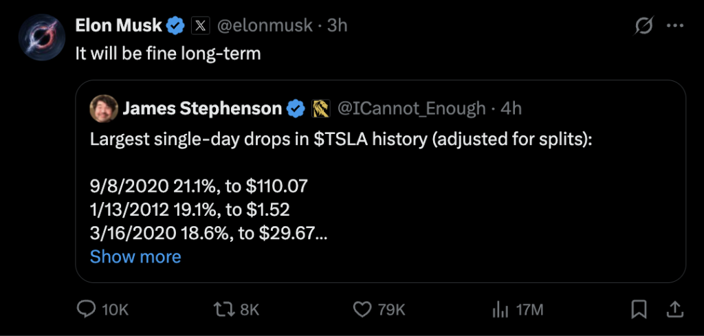 特斯拉CEO埃隆·马斯克在X平台上就股价暴跌回应说,“长期来看,一切都会好起来的。”