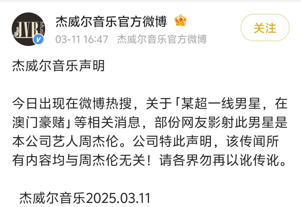 3月11日,周杰伦经纪公司@杰威尔音乐官方微博发文称:“今日出现在微博热搜,关于‘某超一线男星,在澳门豪赌’等相关消息,部份网友影射此男星是本公司艺人周杰伦。公司特此声明,该传闻所有内容均与周杰伦无关!请各界勿再以讹传讹。”