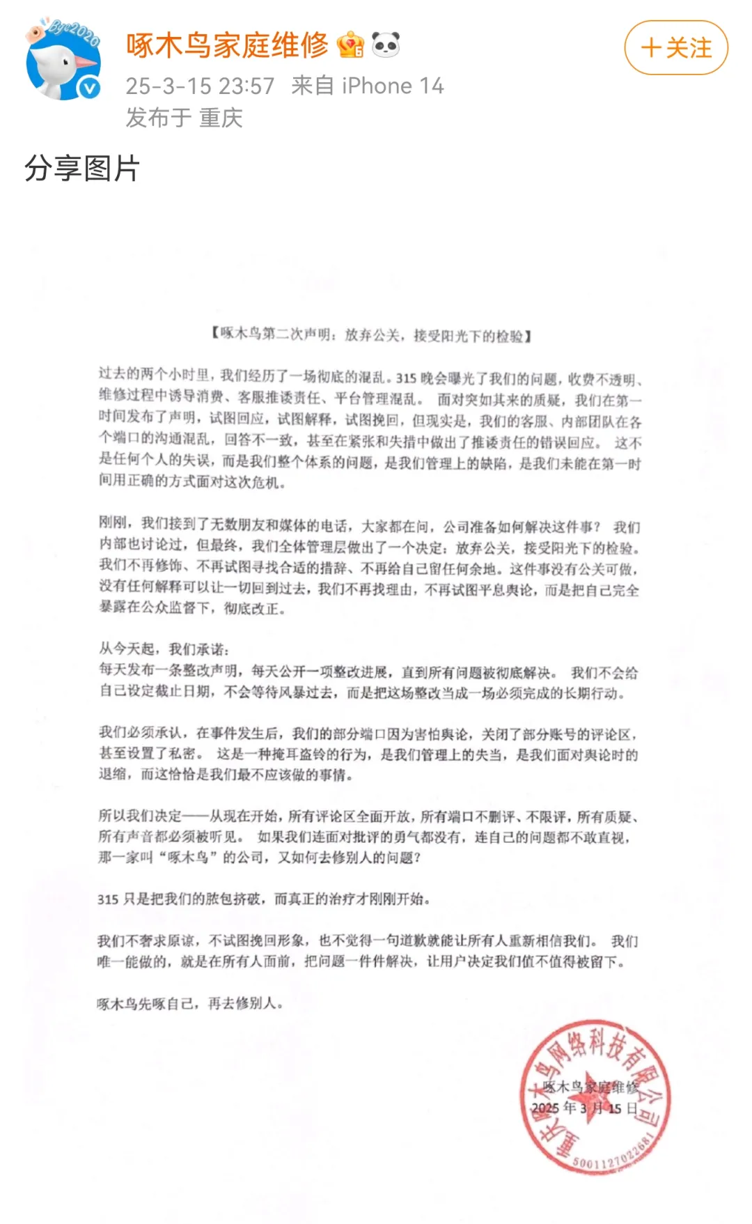 啄木鸟连续发布声明,在第二次声明中,啄木鸟表示“放弃公关”。