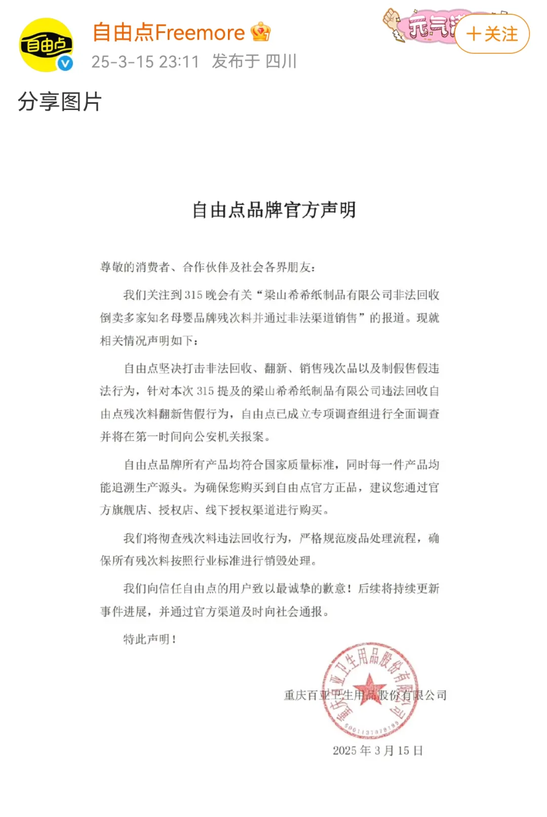 自由点:自由点已成立专项调查组进行全面调查并将在第一时间向公安机关报案。我们将彻查残次料违法回收行为,严格规范废品处理流程,确保所有残次料按照行业标准进行销毁处理。我们向信任自由点的用户致以最诚挚的歉意!
