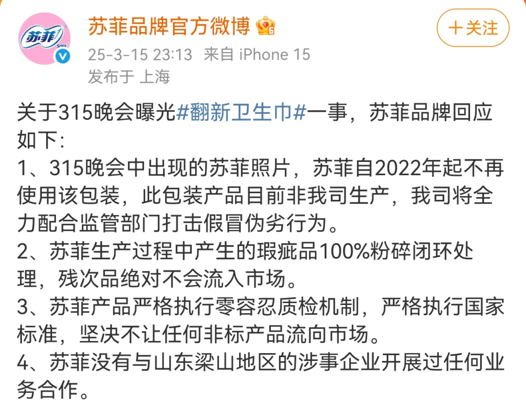 3·15晚会后,多家卫生巾品牌紧急回应!有公司“放弃公关”