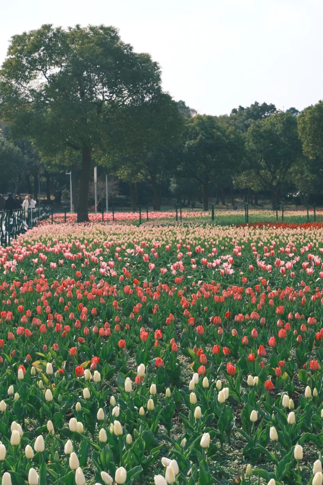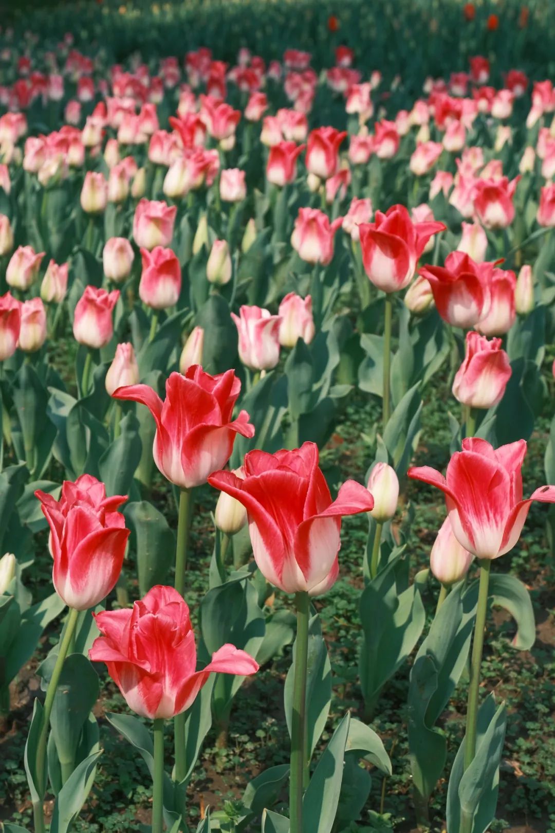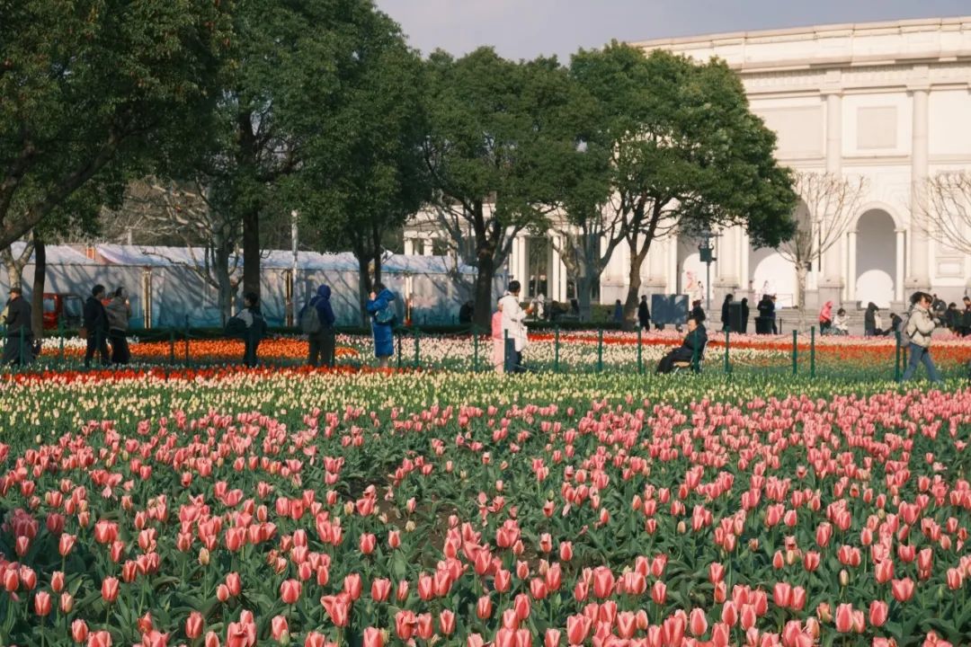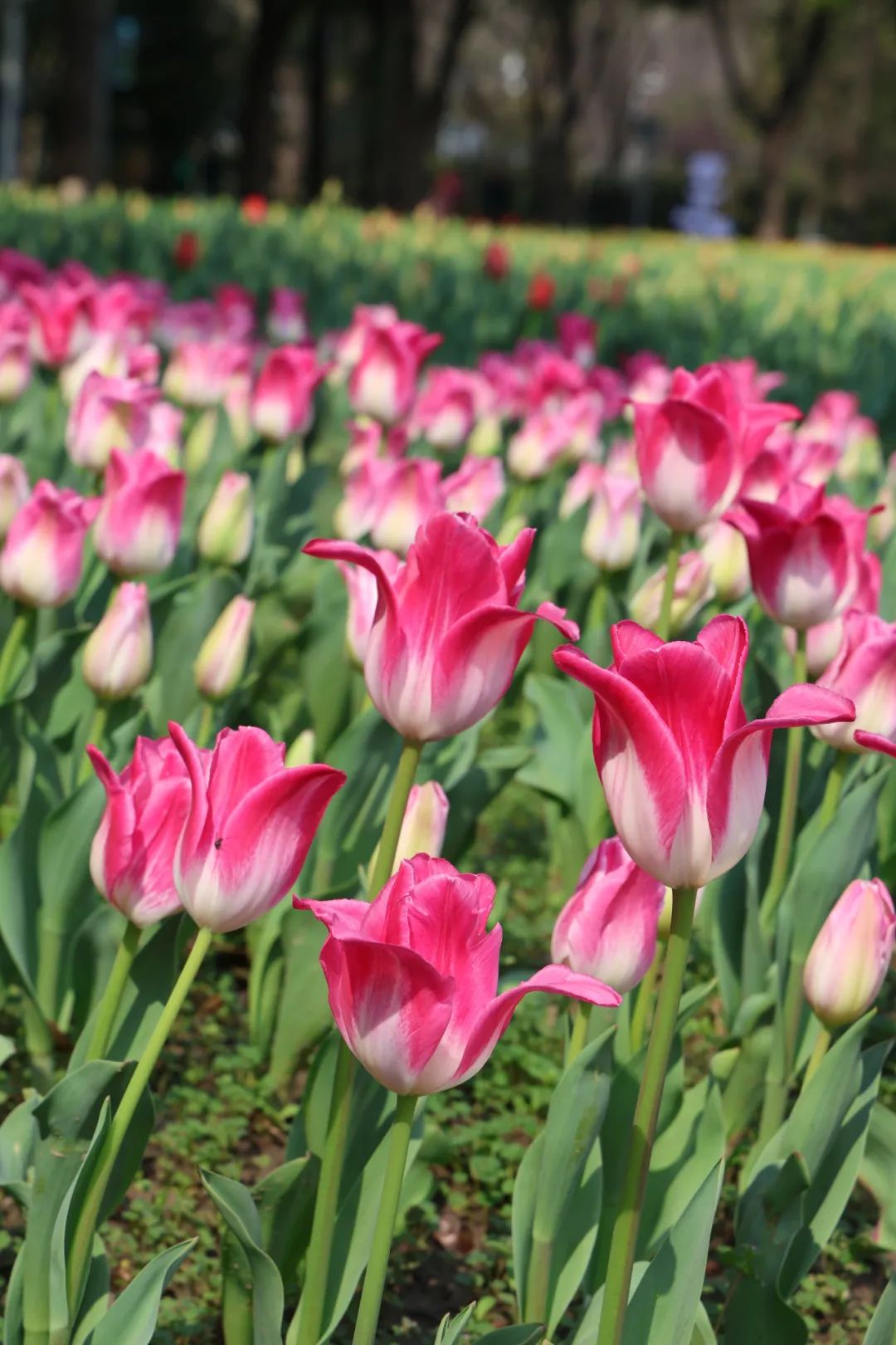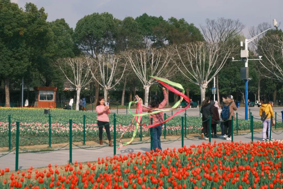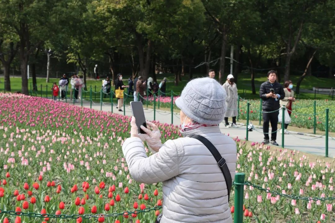 公园内,成片色彩各异的郁金香花田铺满了视野,粉色清新、红色热烈、黄色优雅、白色纯净……层层叠叠,错落缤纷,多彩而和谐。繁花之间,游人如织,或驻足欣赏,或拍照留念,或伴花而舞。