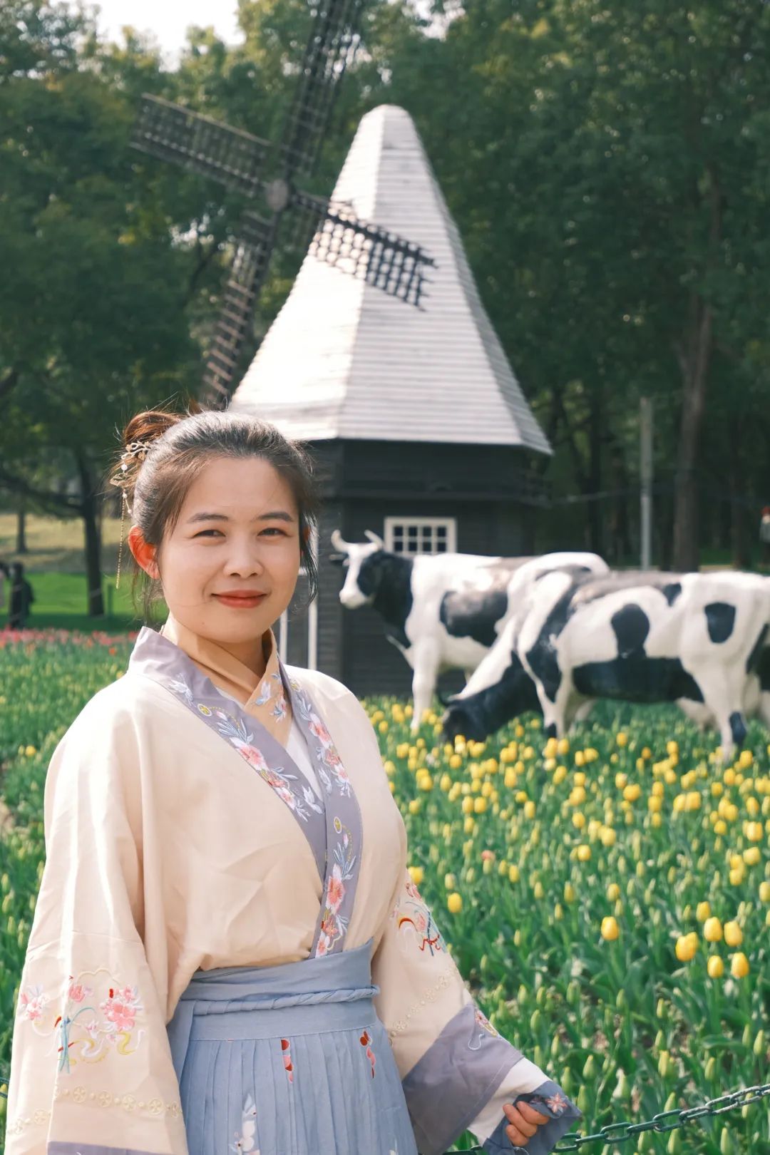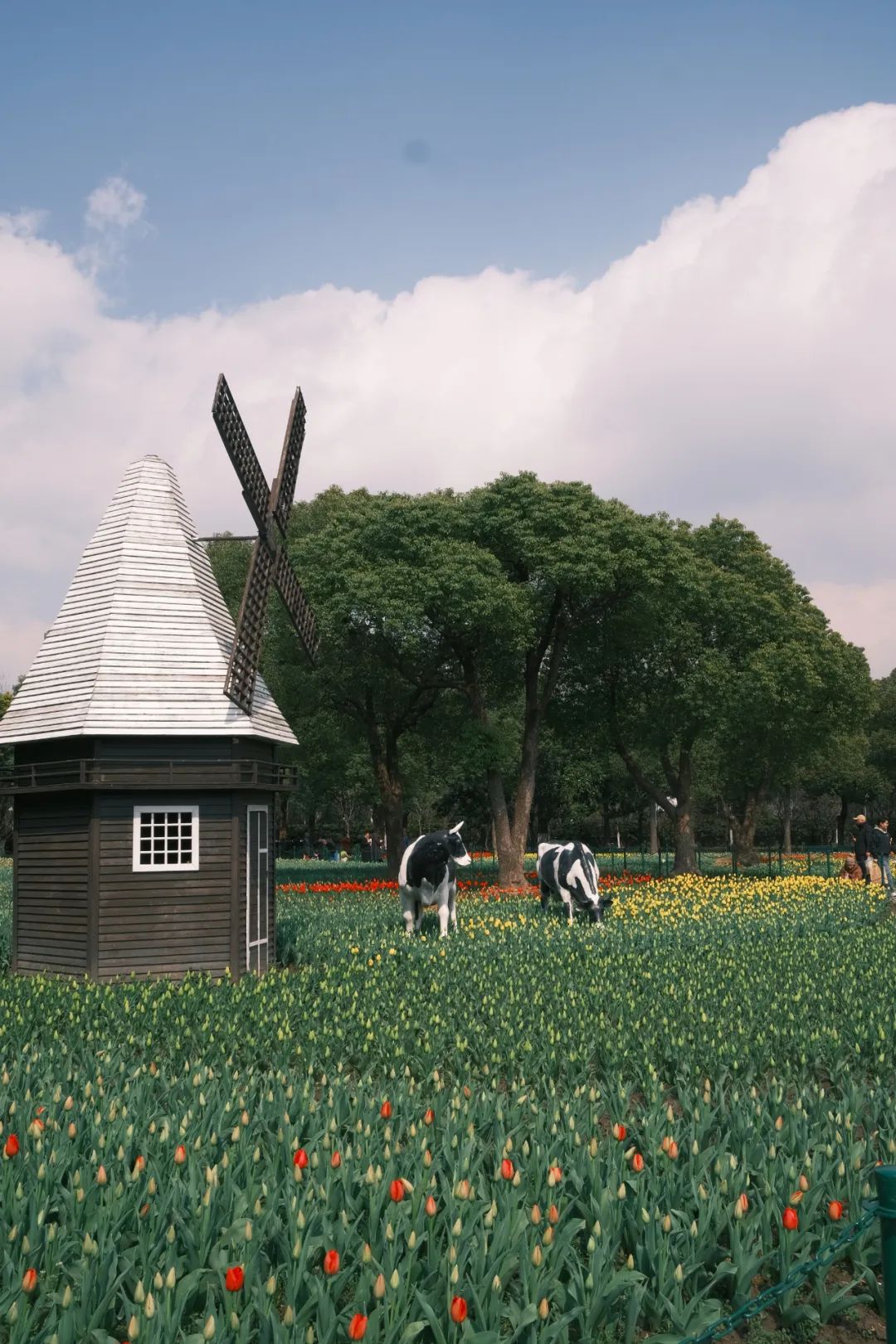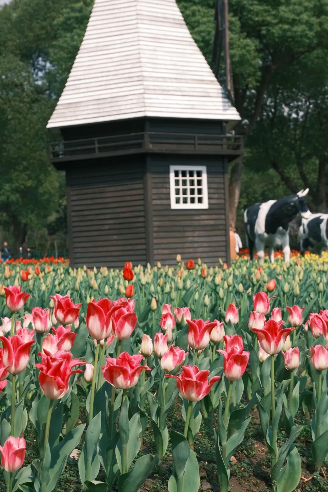 从大宁公园西门进入,步行5—10分钟,即可到达这处花田。这是一片由红色、白色与黄色郁金香交织形成的农场主题花海,木屋、风车与“奶牛”共同勾勒出一幅恬静美好的田园风光图,漫步其中,游客仿佛一秒“穿越”到了荷兰小镇。